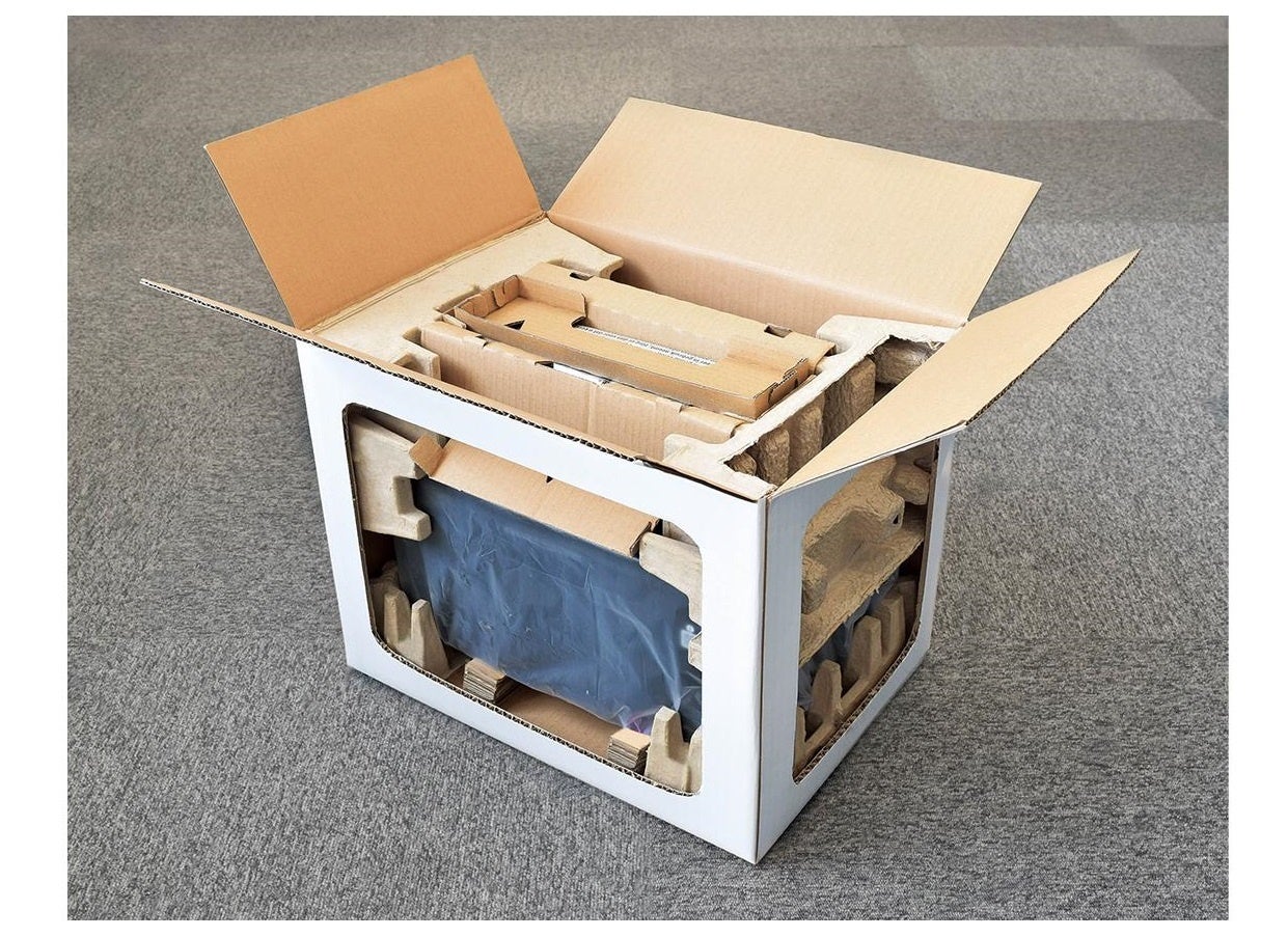 外箱、固定材、緩衝材 :リサイクルのシステムが世界的に確立されている段ボール採用