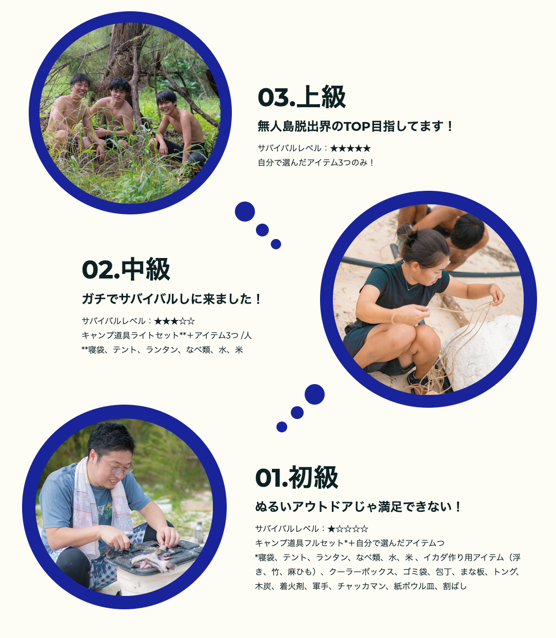 使用できる道具は、予約時にサバイバルレベルを選択することでアイテム数が決められており、上級レベルはテント、ナイフ、ライターなどのアイテムの中から1人3つまで。
