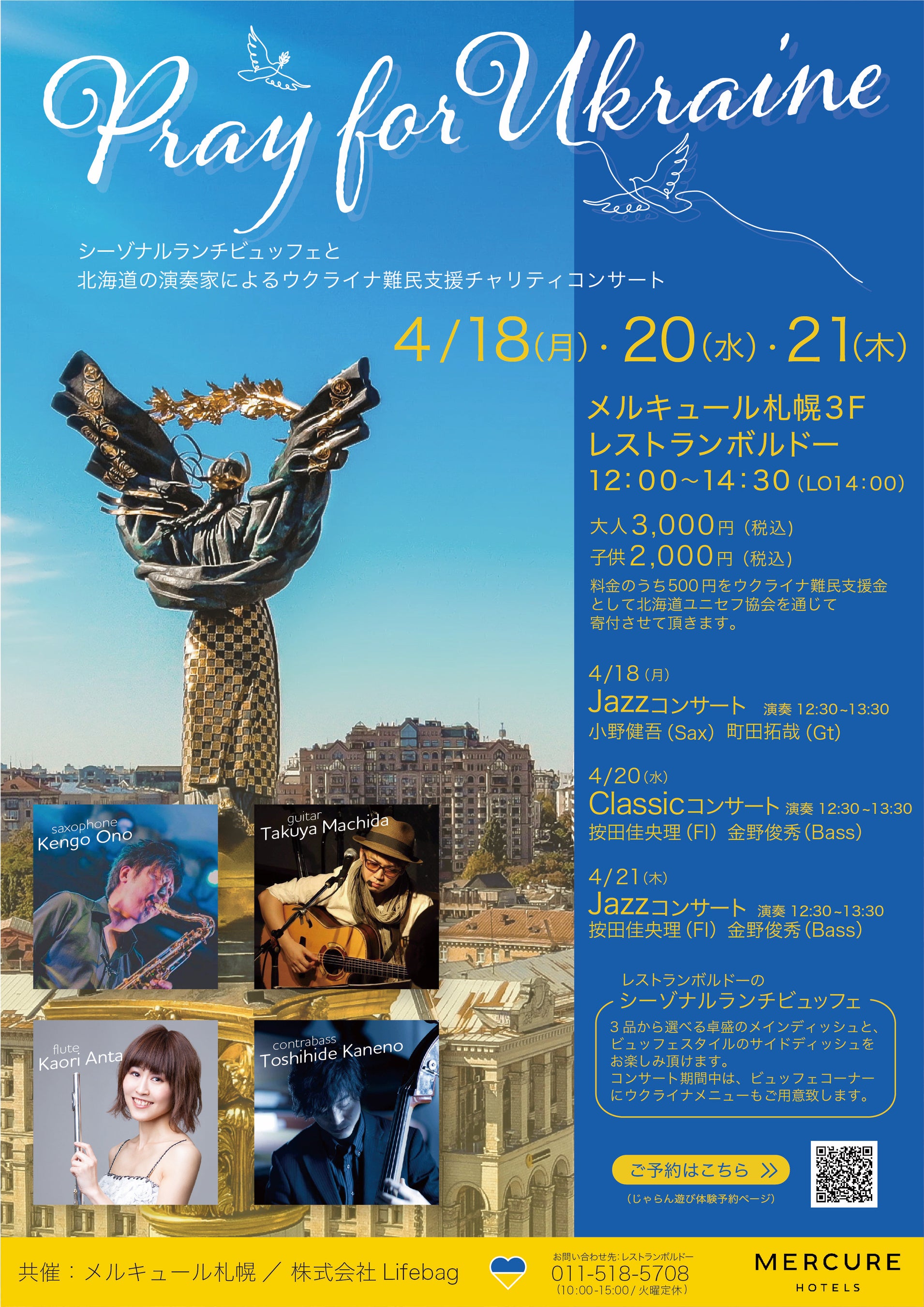 4月18日(月)、20日(水)、21日(木)、株式会社Life Bag様(札幌市手稲区明日風3丁目/代表 相川 隆司様)とのコラボレーション企画により、ホテル3階レストランボルドーにて、北海道の演奏家によるウクライナ難民支援チャリティーランチコンサートを開催致します。売上の一部は北海道ユニセフ協会を通じ、ウクライナの難民支援金として寄付させて頂きます。
