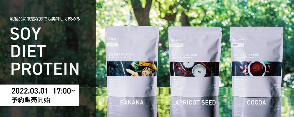 ホエイプロテイン等を展開する株式会社ULTORA(本社:東京都恵比寿、以下弊社)は、公式オンラインストアにて3/25(金)よりソイダイエットプロテイン「バナナ風味」「杏仁風味」「ココア風味」の販売を開始します。(500g税込み価格:¥3,190)