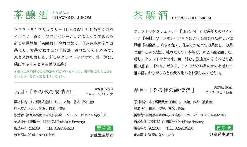 お茶割りのパイオニア「茶割」が、新潮流「クラフトサケ」を推し進める気鋭の酒蔵LIBROMとコラボ、お茶の風味が楽しめる「茶醸酒(ちゃじょうしゅ)」をリリース!