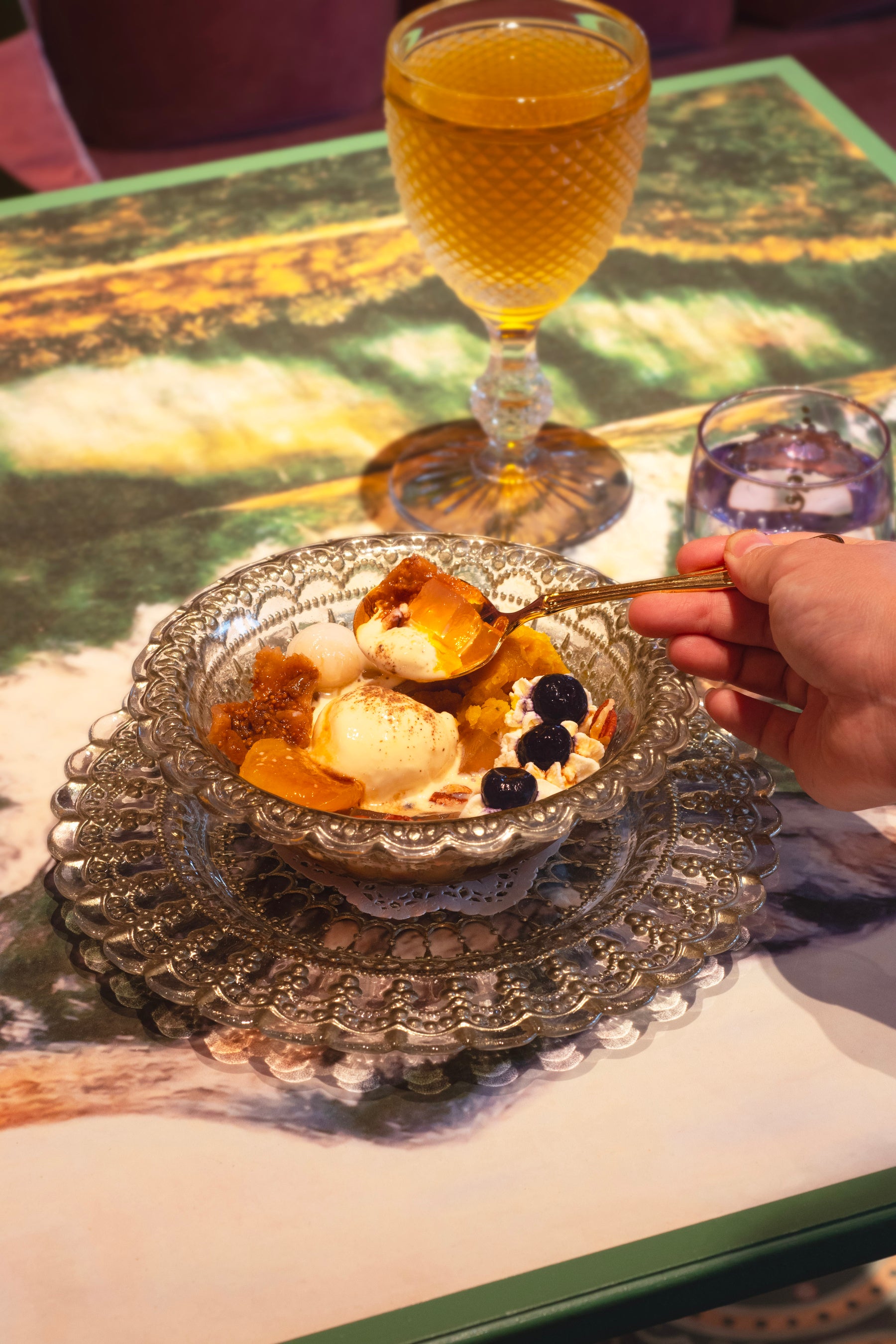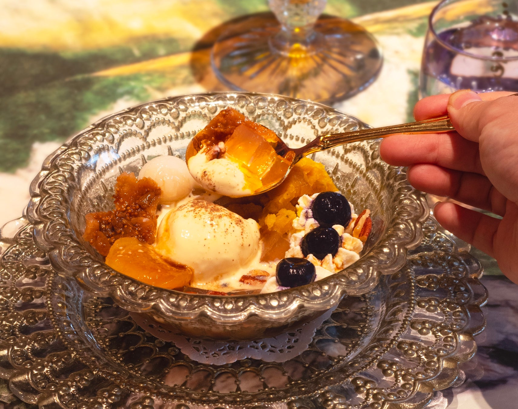 ほうじ茶に漬けた寒天に、皮付きかぼちゃ餡、白玉、自家製いちじく煮と蜜漬けあんず、ローストペカンナッツをトッピングしました。バニラアイスクリームには山椒をひとふり。仕上げにマスカルポーネチーズとブルーベリーのお花を咲かせて…