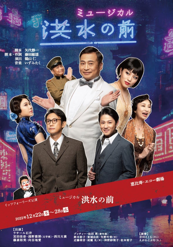 この度、本作、ミュージカル「洪水の前」を、演出に鵜山仁を迎え25年ぶりに再演いたします。主演は作家、演出家としても数々の賞を受賞し、幅広い活躍を続ける稀代のエンターテイナー、ラサール石井。狂言回し役の司会者のほか、フィクサーや軍人など5役に挑戦いたします。ダンスホールの歌姫、徳大寺茉莉役には、シアタークリエのミュージカル「CROSS ROAD~悪魔のヴァイオリニスト パガニーニ~」やミュージカル「魍魎の匣」で高評を得たイッツフォーリーズの宮田佳奈が務めます。作家志望の青年、日暮役は文学座の実力派俳優、浅野雅博が、日暮の友人、安東泰男役は「ミス・サイゴン」「レ・ミゼラブル」などミュージカルを中心に活躍する西川大貴を配役するほか、イッツフォーリーズの女性メンバーが華やかにステージを彩ります。