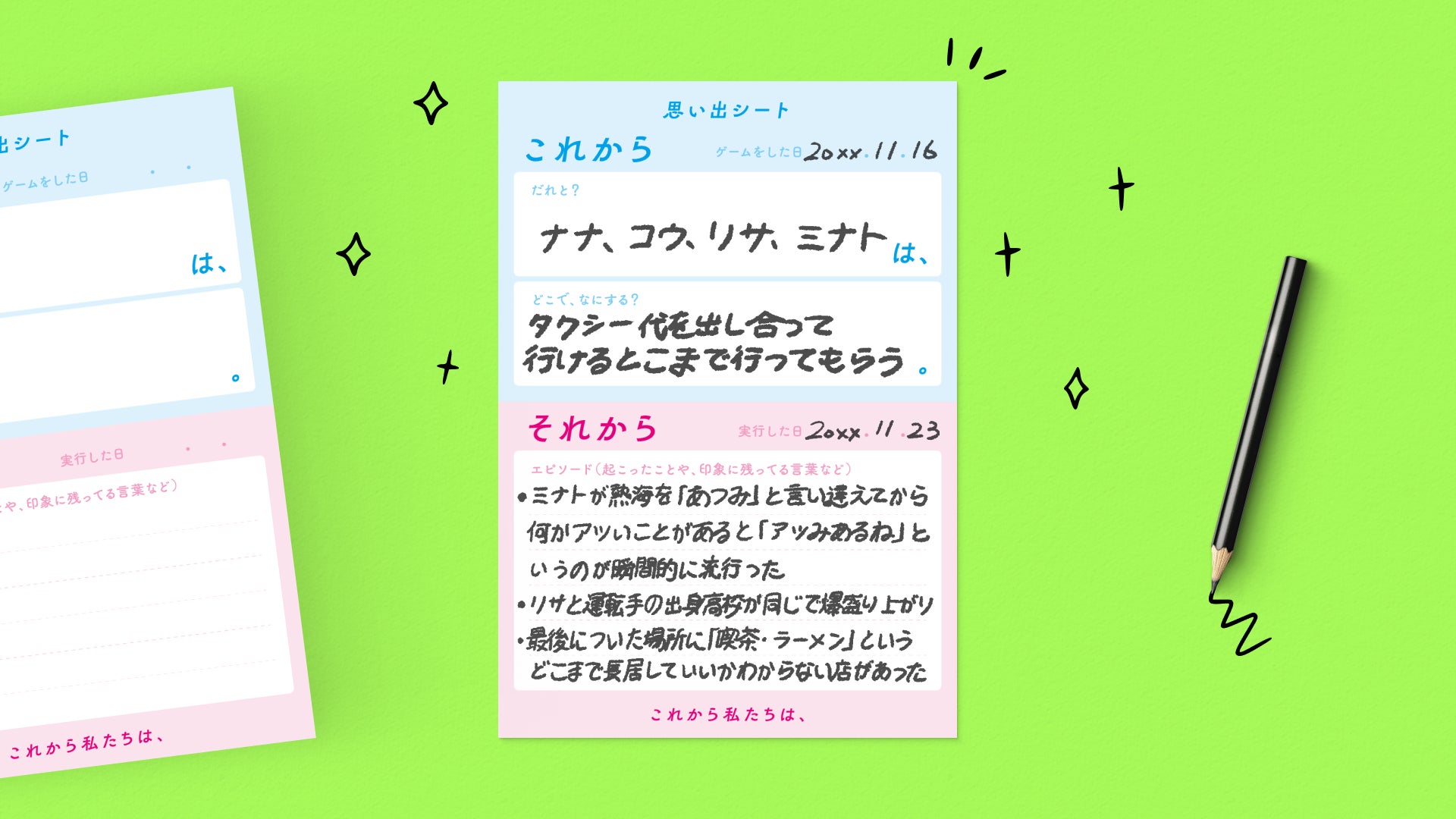 10年経っても忘れない、ずっと語り合える思い出を作れるゲームが作りたくて、本作は誕生しました。 もちろん実行しなくても、みんなの共通でやりたいことがわかるのでその場の話題にするだけでも盛り上がるゲーム内容となっています。