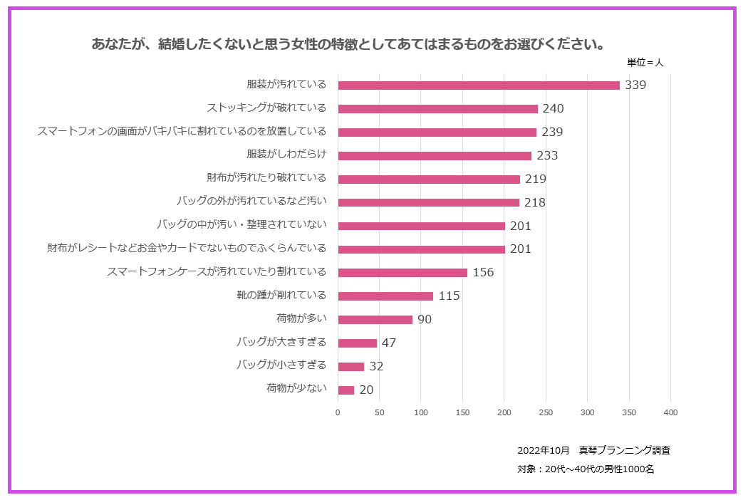 そしてその視点は周辺のものをきちんと整備できるか、他人を驚かせるような異常な状況やだらしない状況を放置しないかという点にも及びます。スマホの他に見られている例としては、カーディガンがしわしわだったり、踵のヒールがえぐれている、ストッキングに穴があいているなどのポイントで、「物を大切にしない人なのかな」、「自分のだらしなさを客観視する力がないのかな」と思ってしまうようです。
