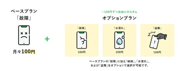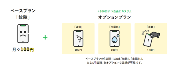 ベースプランの「故障」に加え、「破損」「水濡れ」「盗難」をオプションで選択が可能です。すべて加入しても月々最大400円で、年間最大10万円(通算)まで補償されます。自分に合った補償を自由に選択して加入することができるので、最低100円で入れます。