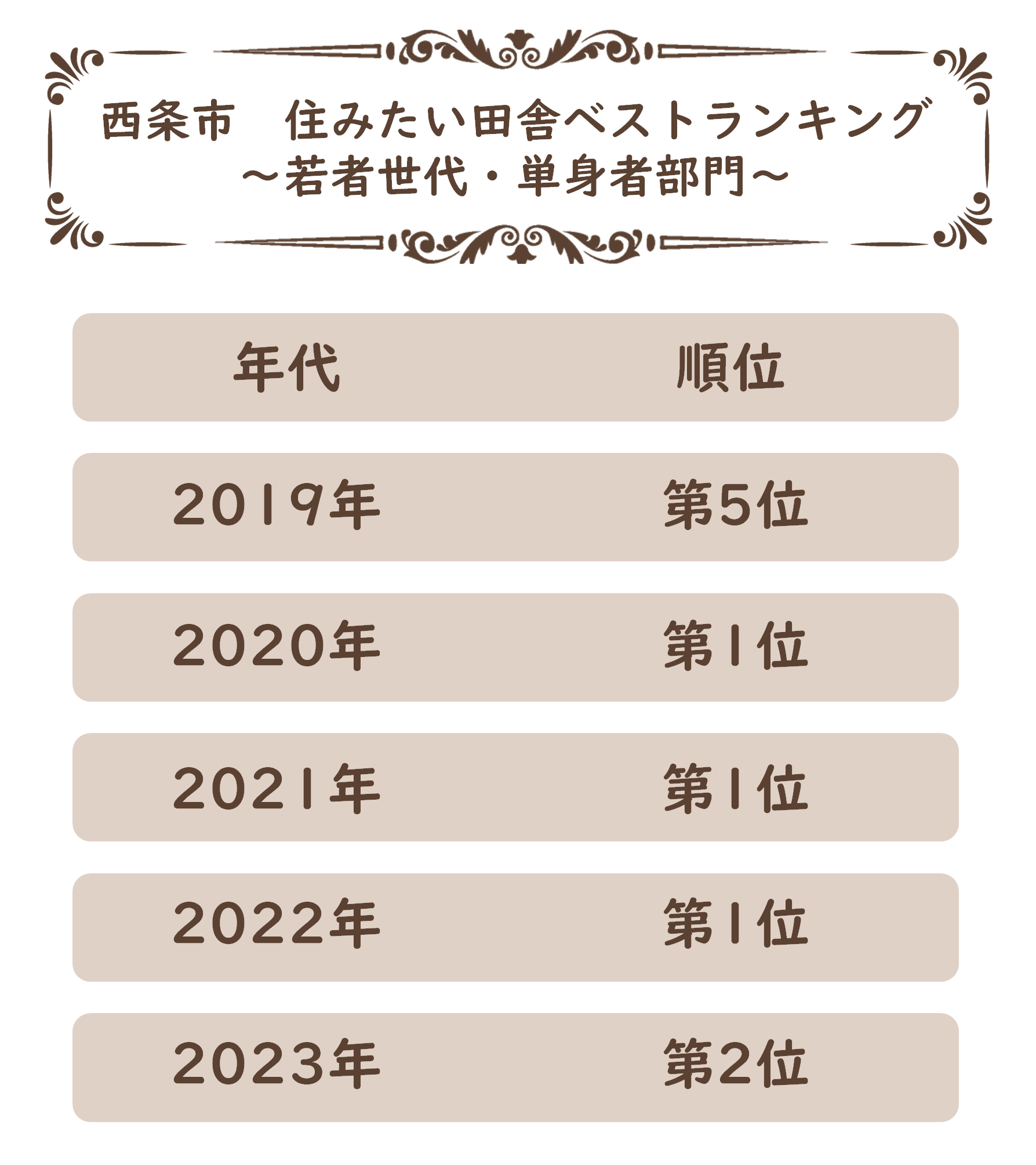 愛媛県西条市は、株式会社宝島社が発行する『田舎暮らしの本』(2023年2月号)で発表された「2023年版 住みたい田舎ベストランキング」若者世代部門において全国2位を獲得、2020年から続く4連覇はなりませんでしたが、2019年から数えて5年連続でトップ5入りを達成しています。