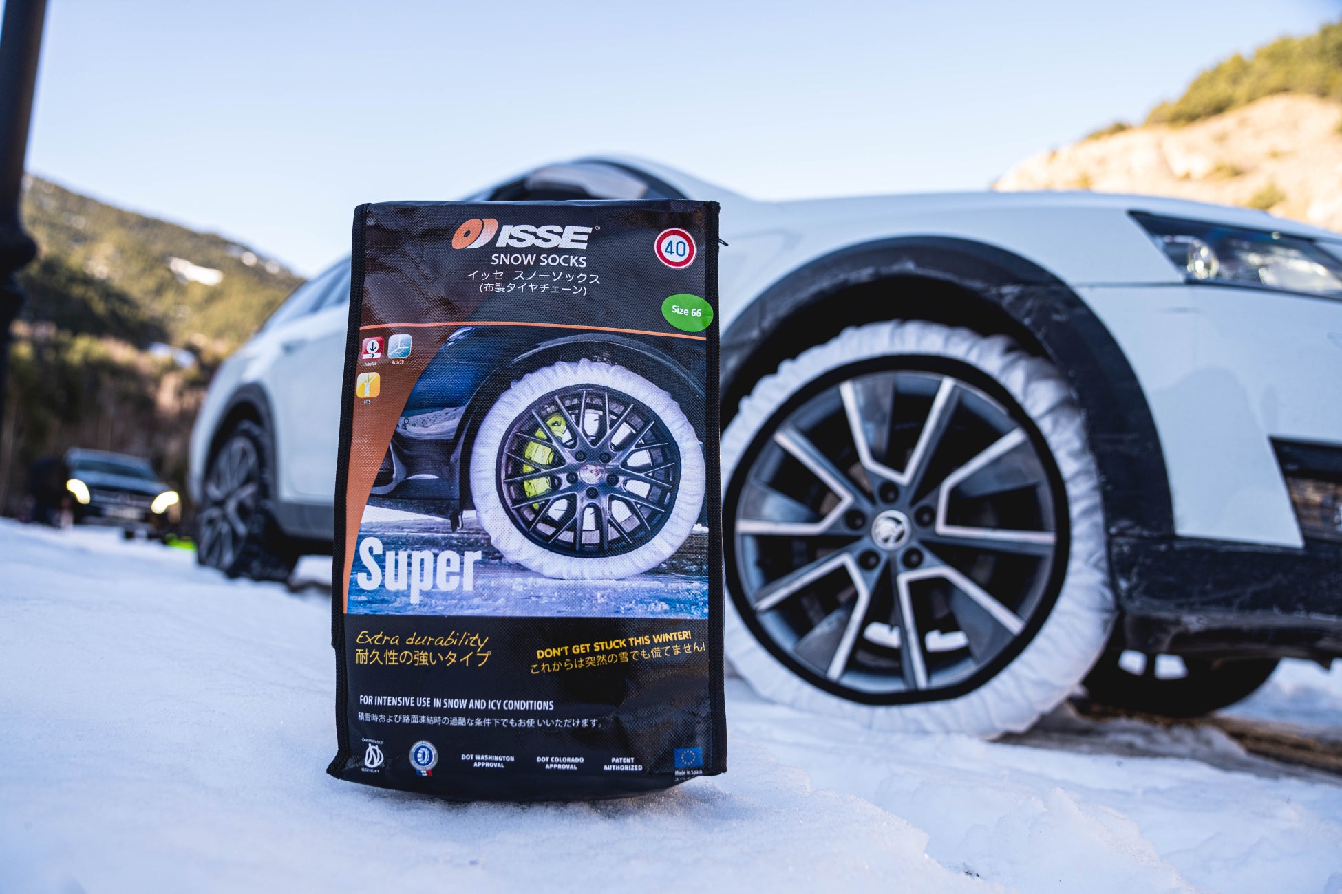 イッセ・スノーソックスは北米・ヨーロッパでの成功を経て、2019年、満を持して日本に上陸しました。軽量でコンパクト、装着わずか3分という手軽さながら、数ある布製タイヤチェーンの中でも圧倒的な耐久性を誇り、加速、制動、登坂性能のテストおいて金属チェーンと同程度のパフォーマンスを達成しています(*)。日本においては欧州自動車メーカーのインポーター2社にて純正アクセサリーに採用されている他、ロードサービスや道路維持補修の現場でも活躍の場を拡大しています。全国の大手自動車用品店やタイヤショップ、ホームセンター等で次々と配荷を果たし、冬のドライブを支える力強いアイテムの一つとして大きな注目を集めています。