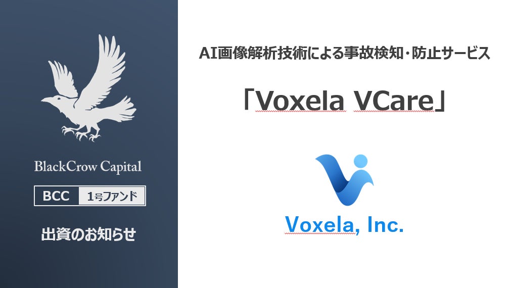 BlackCrow Capital合同会社(代表:菅原 康之、本社:東京都渋谷区)は、同社が運営するBlackCrow Capital 1号投資事業有限責任組合(以下、ブラッククローキャピタル1号ファンド)より、AI画像解析技術による事故検知・防止サービス「Voxela VCare」開発するVoxela社に出資したことをお知らせ致します。今回のVoxela社への出資により、「Voxela VCare 」の早期普及を助け、超高齢化時代の介護事業所の生産性向上を図ると共に、加齢等により活動に不自由が生じてもプライバシーを保ちつつ、すべての人が自分らしく生活し続けられる社会の実現をサポートして参ります。