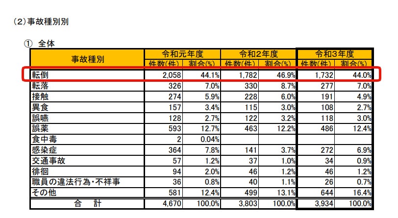 介護サービス事業者は、利用者に対するサービスの提供により生じた事故を市町村(保険者)に報告することが義務づけられていますが、福岡市、江東区、みやま市などのいくつかの自治体はその件数を集計しwebsite等で公開しています(※3、※4、※5)。その集計によると、自治体によらず事故種別として最も多いのは「転倒」であり、その割合は44~67%に及びます。