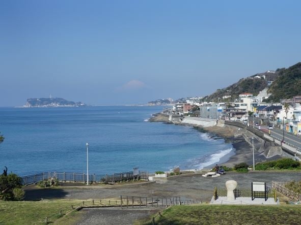 本物件が所在する神奈川県の稲村ケ崎エリアは、鎌倉・由比ヶ浜と江ノ島に挟まれた海岸沿いに位置しています。湘南の海を横目にできる国道134号線が通り、観光地や別荘地として人気の高いエリアです。真向いには、富士山方面に落ちる夕日がとても美しいことで有名な「稲村ケ崎公園」があり、通年多くの人が訪れます。本物件は、目の前に海が望める、約323坪の物件です。