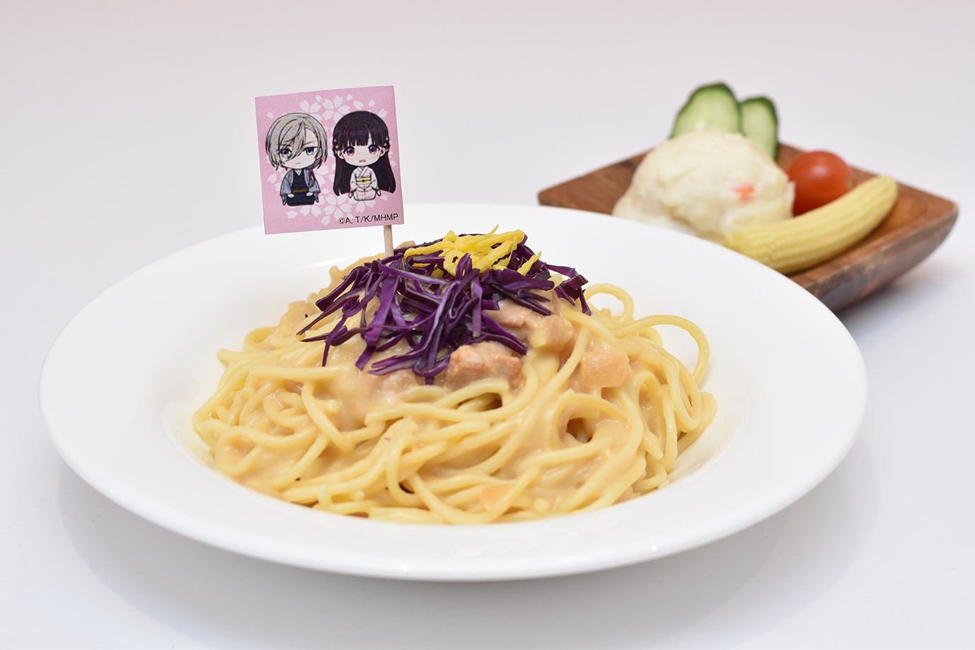 クリームパスタに美世が清霞に贈った「組み紐」をイメージした紫キャベツと錦糸卵を飾りました。ランダムフラッグ付。