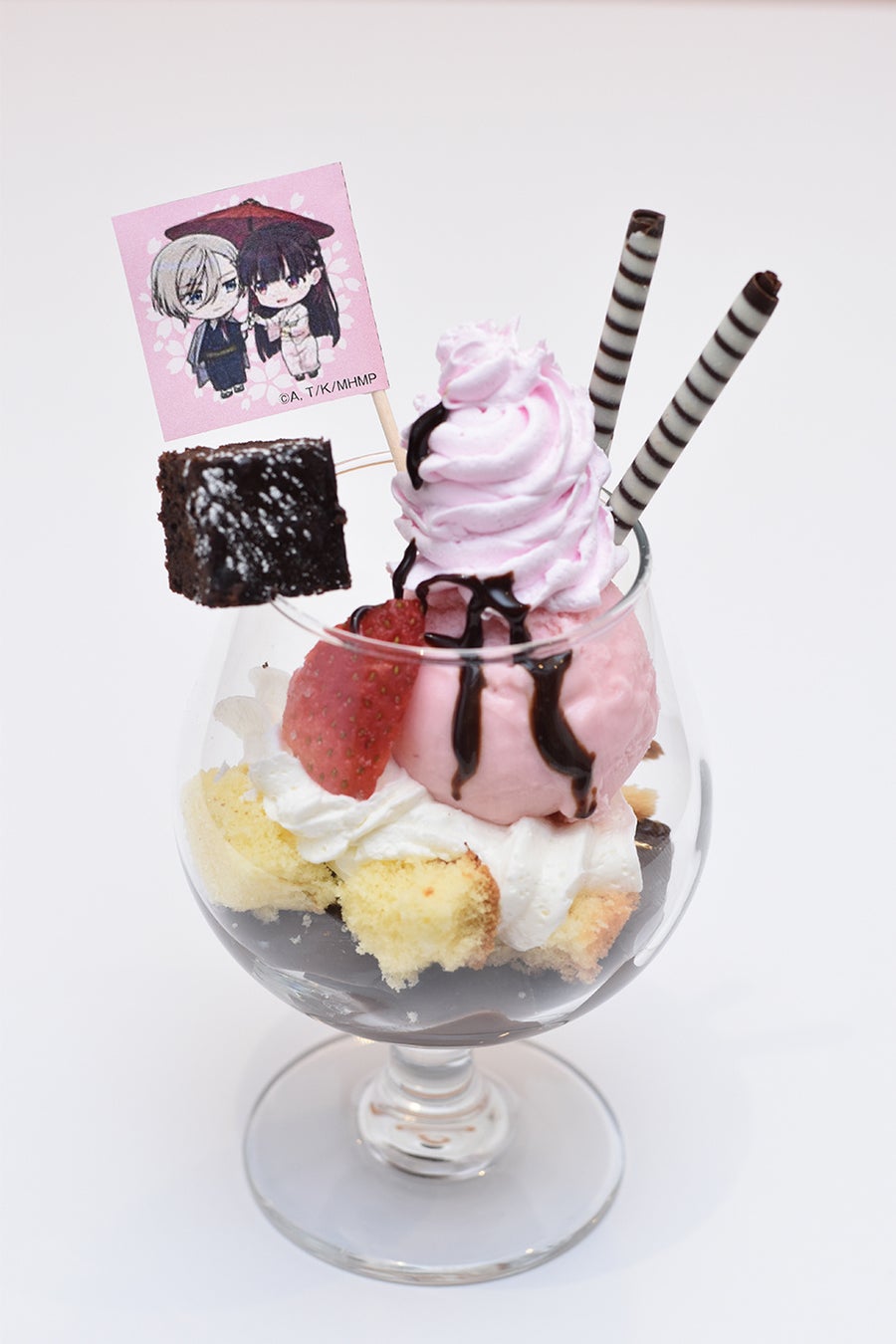 チョコプリンとイチゴのパフェにブラウニー、巻きチョコを飾りました。ランダムフラッグ付。