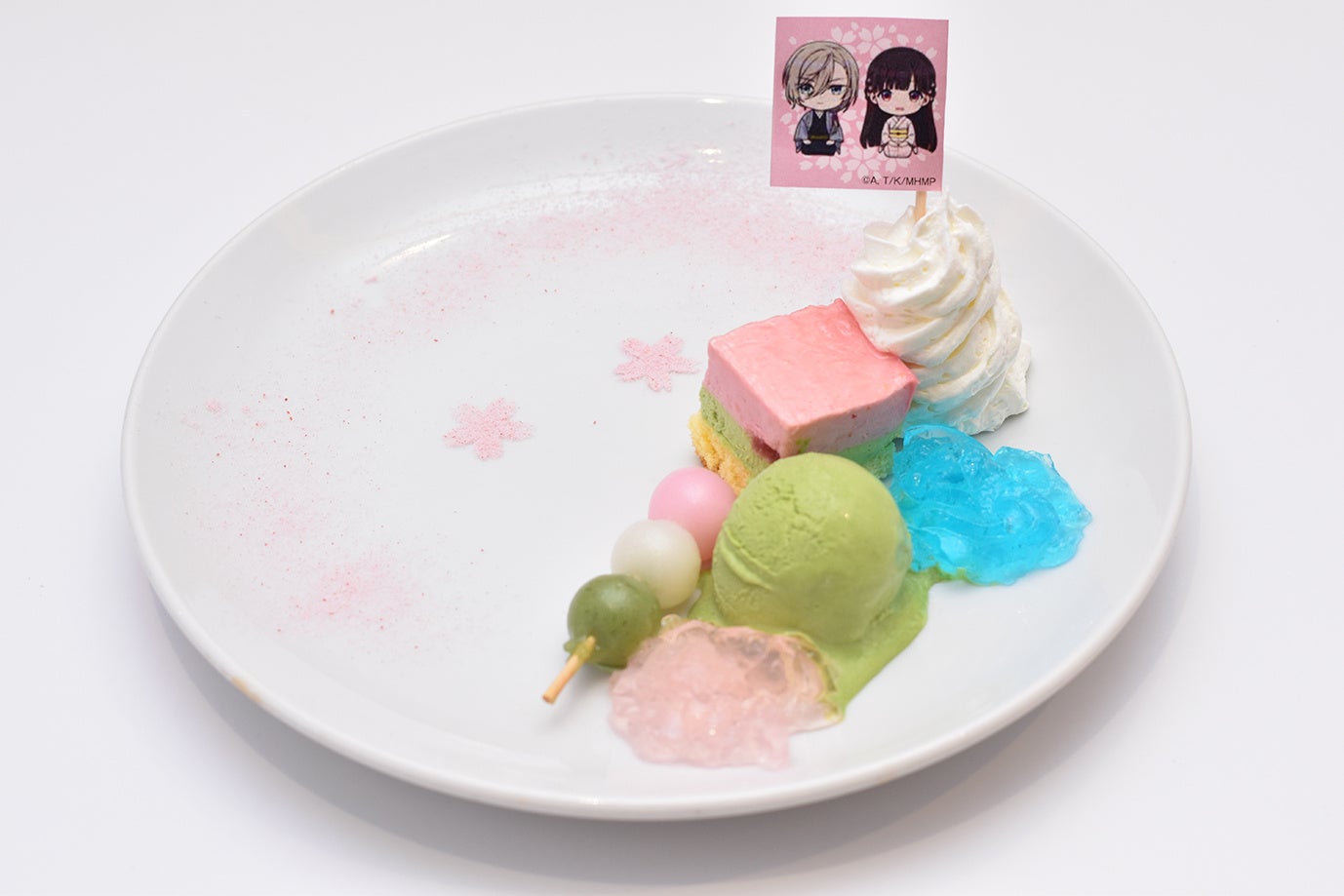 ベリーとピスタチオのムース、抹茶アイス、三色団子に美世と清霞の瞳のようなゼリーを添えました。ランダムフラッグ付。