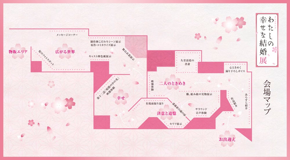 本企画展の会場マップを公開!5つのエリアに分かれ、「わたしの幸せな結婚」の“ときめき”を体感いただけます。