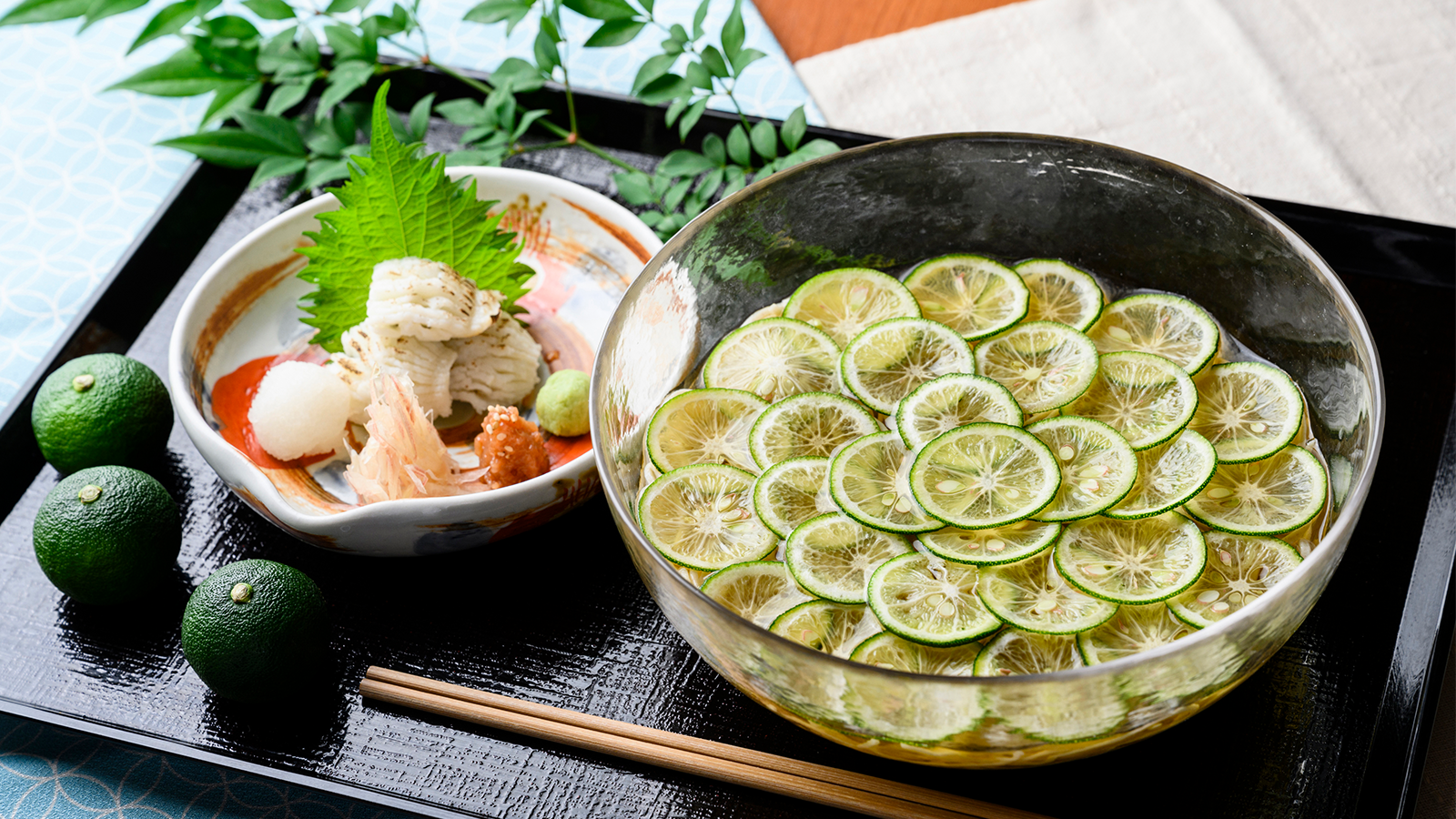 すだちの深い緑に、茗荷と梅肉の彩りが華を添えます。