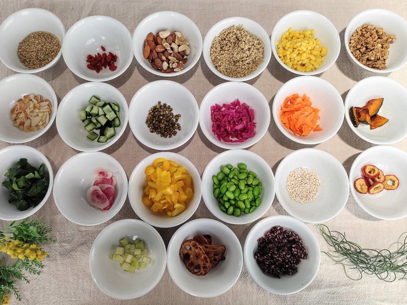 たくさんの花や木々が色づく春をイメージした彩りあふれるサラダとスープ。自家製シナモンオートミールなど24品目を使った腸活サラダ。