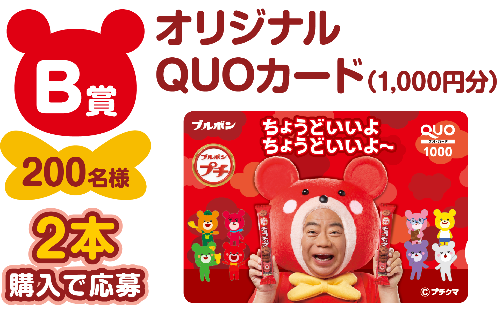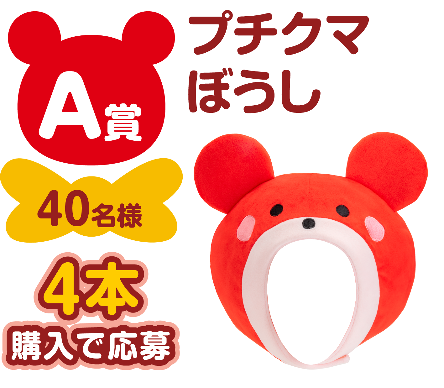 ブルボン「プチシリーズ」を購入し応募いただいた方の中から抽選でA賞「プチクマぼうし」(40名様※4本購入で応募)、B賞「オリジナルQUOカード1,000円分」(200名様※2本購入で応募)をプレゼントします。