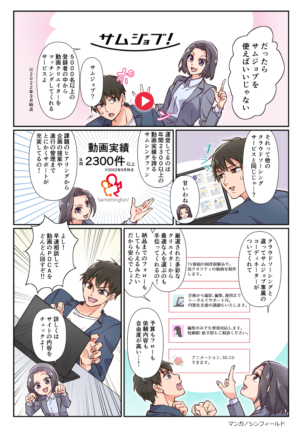 クリエイターの人材派遣、人材紹介事業を行うサムジョブでは、現在動画クリエイターの登録者数が5,000名を突破し,動画制作におけるリソース不足、内製化支援、集客、コンテンツ量産などを課題としている企業と動画クリエイターを専属のコーディネーターが選定し、最適な人材をご提案させて頂くサービスです。