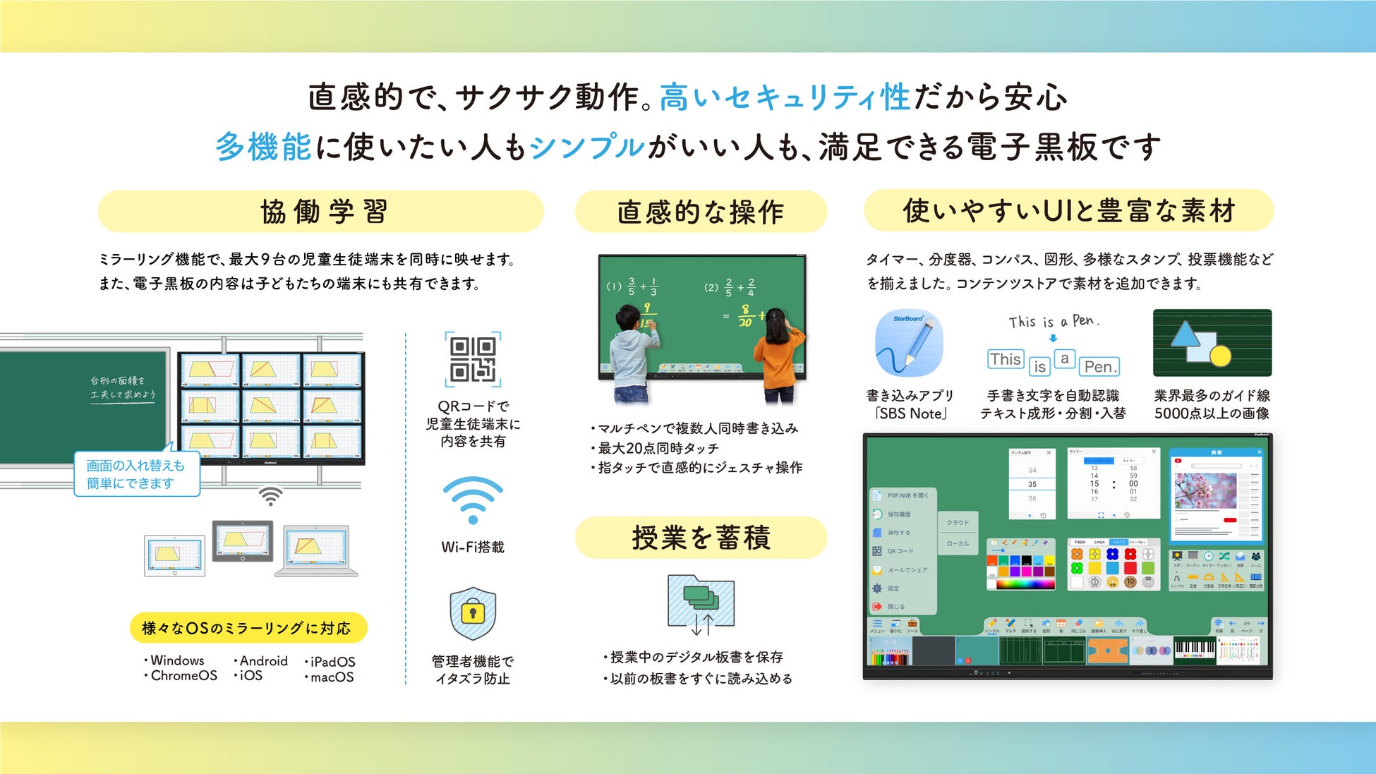 スライードには、80カ国40万台以上の導入実績を持ち、最大9台の児童・生徒端末の同時ミラーリング機能など、現代のICT授業に最適化された電子黒板機能を搭載している「StarBoard」を採用しています。