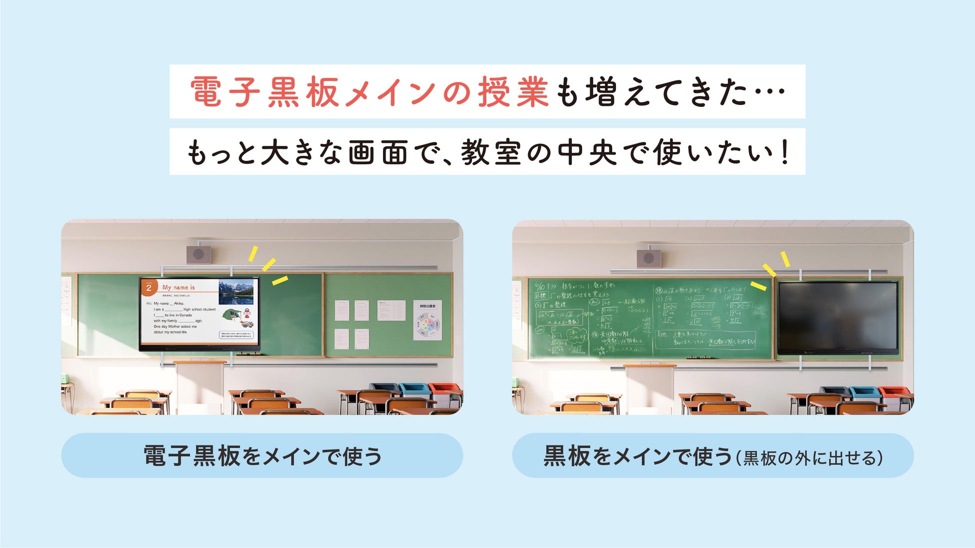 電子黒板を教室前面の中央に設置する方法はこれまでにもありましたが、黒板を取り外して電子黒板を設置する必要があるため、黒板を使った授業がまだまだ主流の日本ではこの設置方法は受け入れられていませんでした。