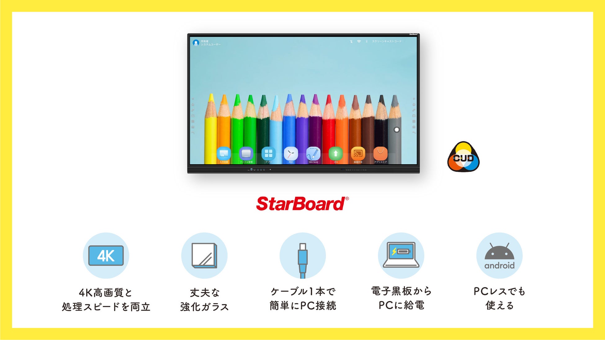 照明や太陽光の反射を抑え、なおかつ頑丈なIPSパネルで斜めからも見やすいのが特徴です。色覚バリアフリーを示すCUD(カラーユニバーサルデザイン)認証マークも取得済みの「どの席からも、みんなからも見やすい」ディスプレイ型電子黒板です。