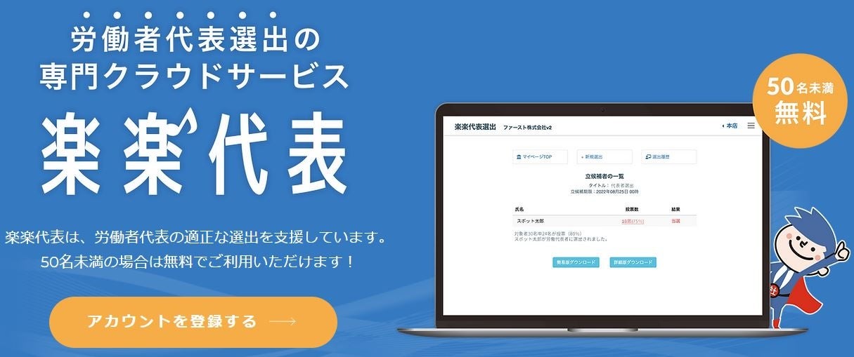 顧問料0円の社労士サービスを展開するスポット社労士くん社会保険労務士法人(本社:東京都千代田区、代表:関根 光)は、労働者代表を適正に選出するクラウドサービス「楽楽代表」をリリースしました。