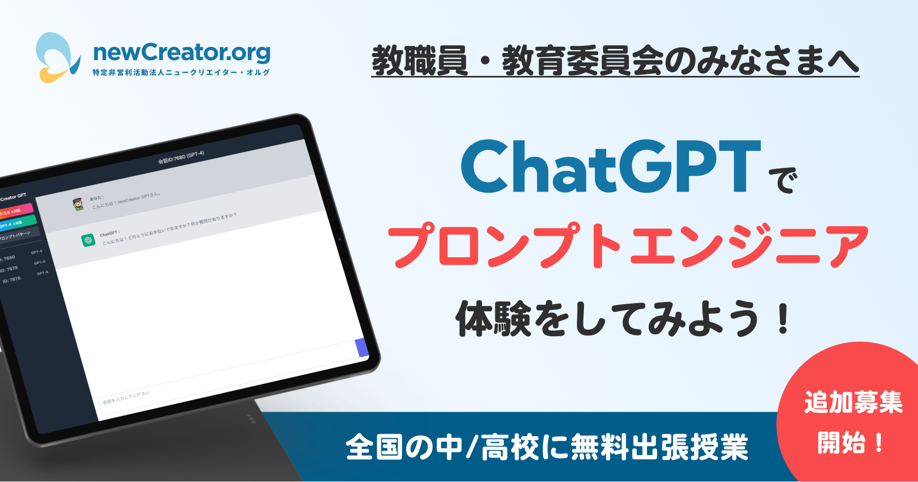 特定非営利活動法人ニュークリエイター・オルグは、中学校・高等学校を対象に無償でChatGPTを利用したプロンプトエンジニアリングの体験授業を無償で提供しています。