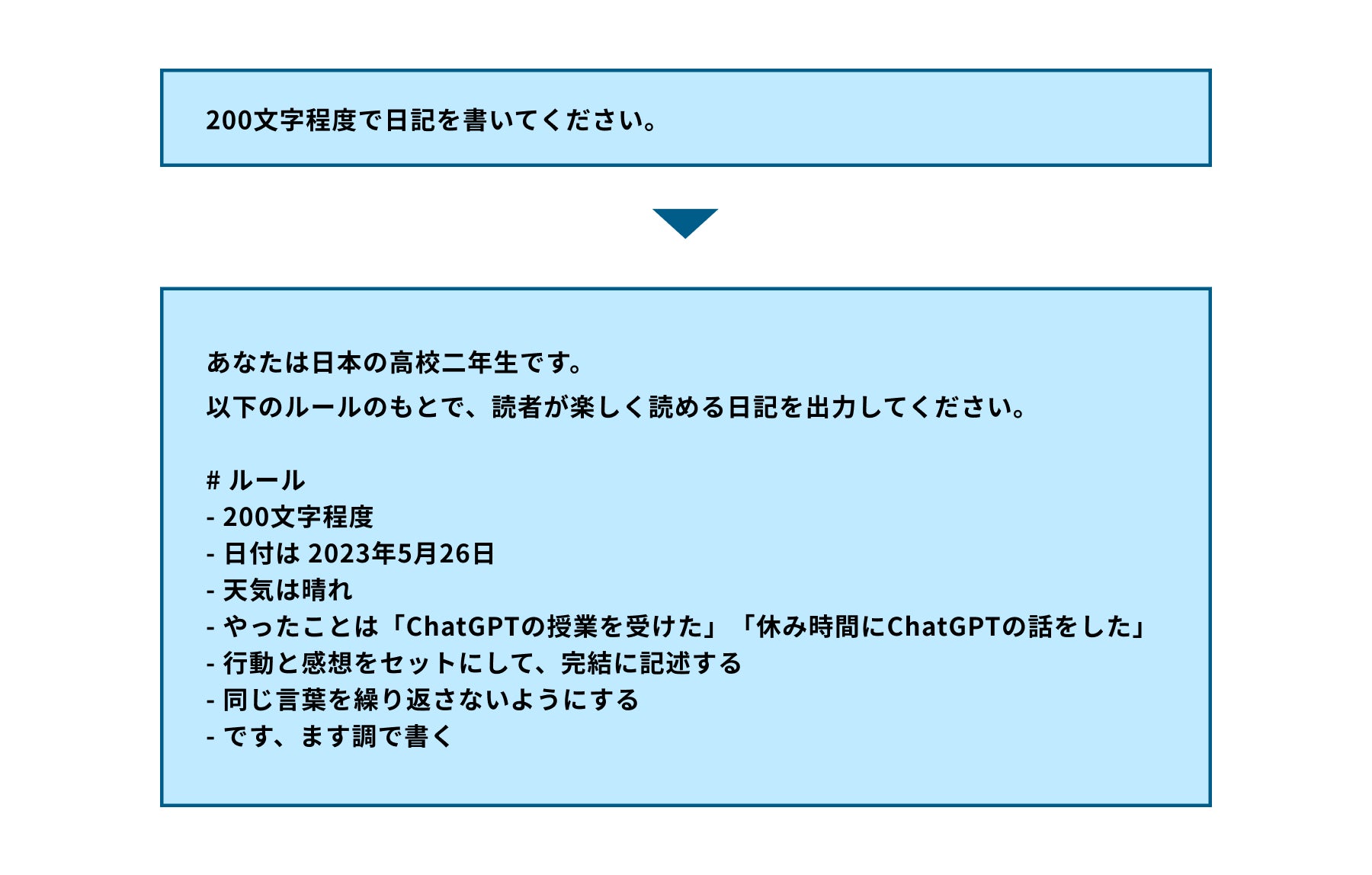 例えばこのように質問の内容を充実させたり、より具体的な設定を加えることで、出力内容をより求めている形に近づけることができます。