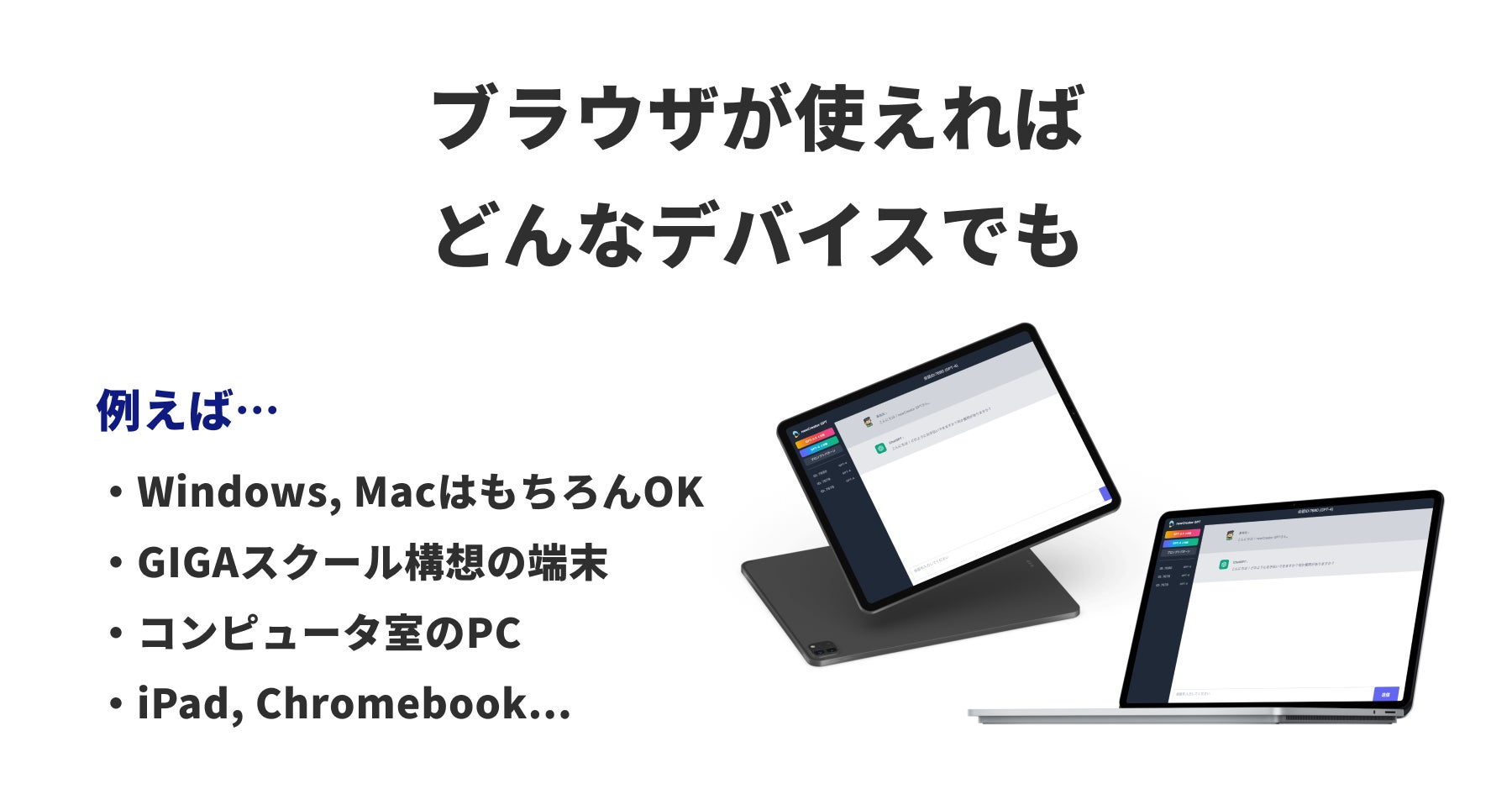 PC、タブレット等はブラウザ(Chrome、Safariなど)が使えるものであれば本体験授業を受けていただくことが可能です。
