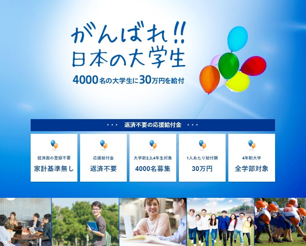 応募の受付は2023年3月6日(月)から開始。4年制の学部・学科に所属している学生に一時金30万円(返済不要)を給付します。応募者の経済状況は問いません。