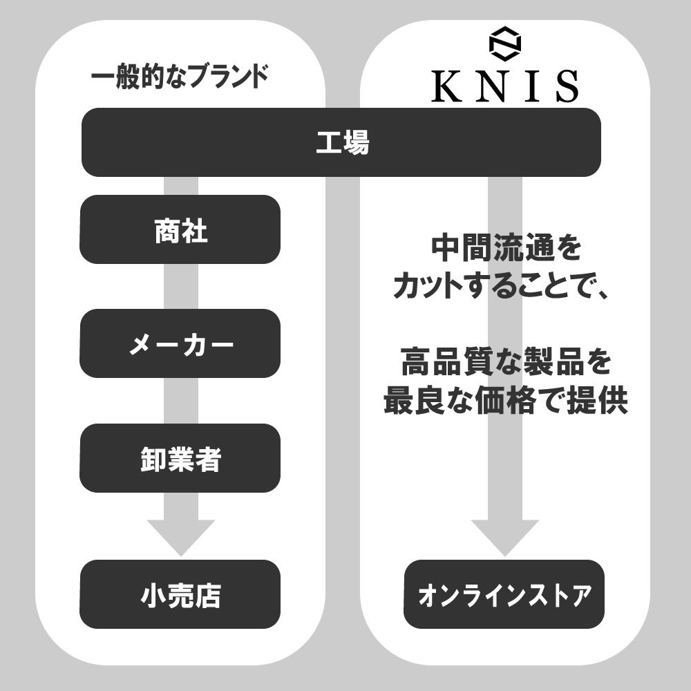 KNISはこのSPA方式を採用し、インターネット販売という形態を取り、中間マージンの削減によって、最良な価格で提供します。