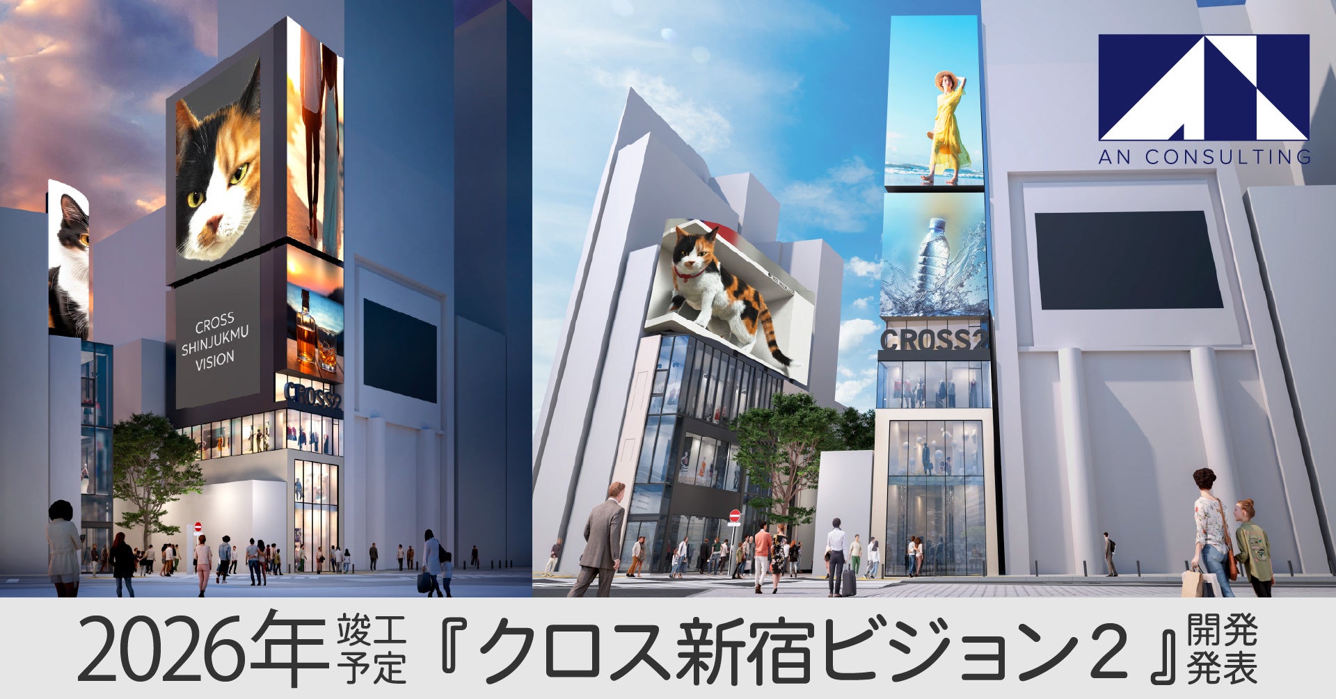 世界を驚かせた3D巨大猫こと「新宿東口の猫」が日々放映される「クロス新宿ビジョン」を開発した株式会社アンコンサルティング(本社:東京都千代田区、代表者:小谷 周)は、現ビジョンと並び立つ縦型の新ビジョン『クロス新宿ビジョン2(仮称)』が設置される『クロス新宿ビル2(仮称)』を2026年に開業予定であることを発表いたします。2つの大型ビジョンを連動させ、ダイナミックな映像を提供することで、新宿駅前をますます発展させる、新しいランドマークを目指します。