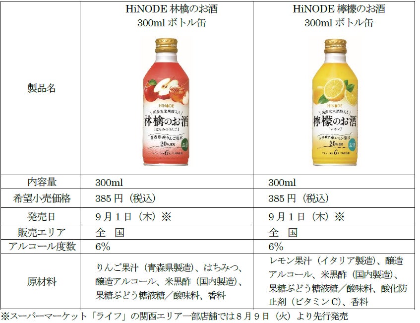 日の出みりんを手掛けるキング醸造株式会社(兵庫県加古郡稲美町、社長:大西浩介)は、リキュールの新ブランド「HiNODE」第一弾商品として「HiNODE林檎のお酒」「HiNODE檸檬のお酒」を9月1日(木)より全国にて発売いたします。また、スーパーマーケット「ライフ」の関西エリア一部店舗では8月9日(火)より先行発売いたします。名高い産地の厳選果汁を贅沢に20%使用。さらに国産玄米黒酢を絶妙にブレンドし、果汁だけでは表現できない爽やかで満足感のある味わいに仕上げた自信作です。