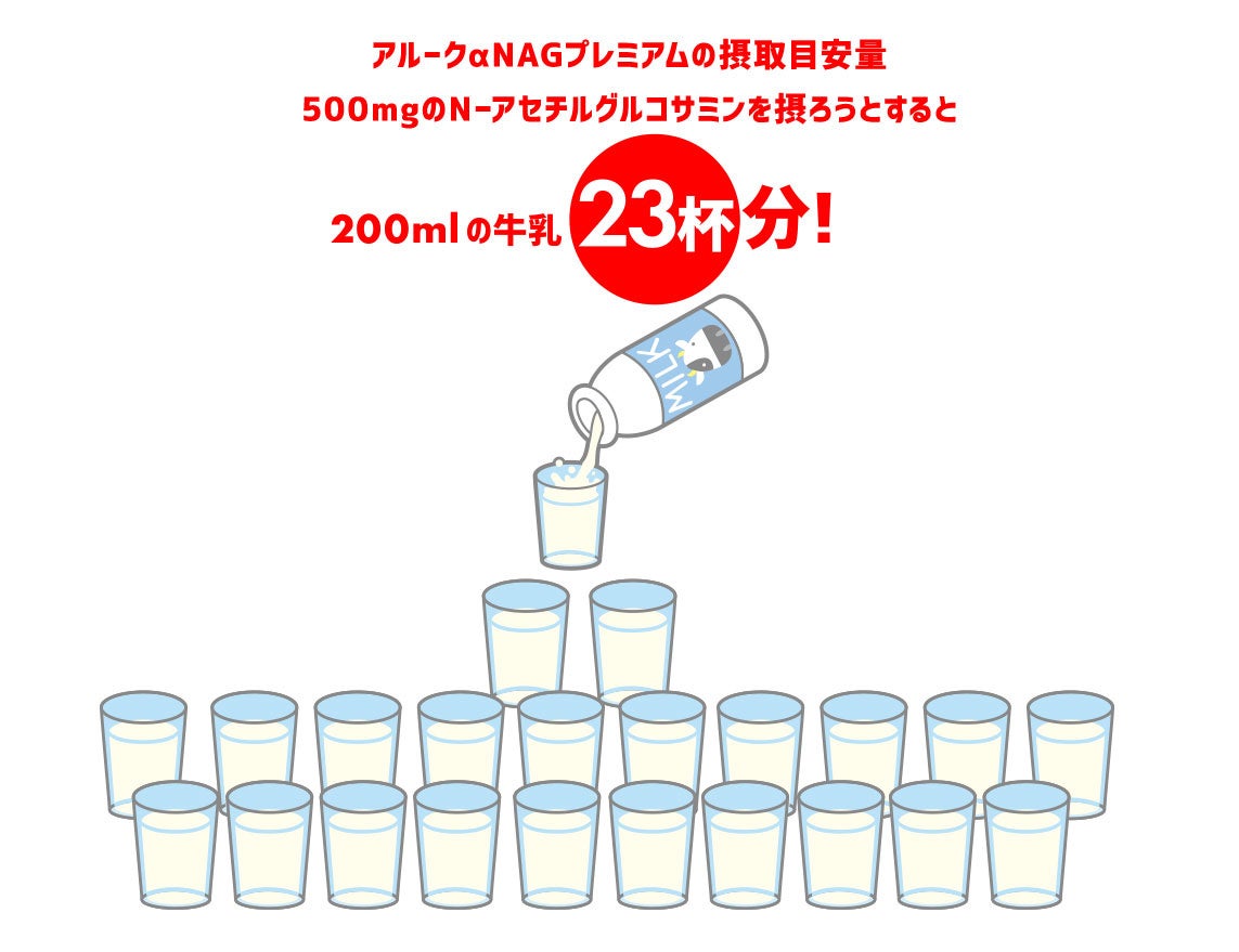 アルークα NAGプレミアムの摂取目安量500mgを牛乳でとろうとすると約23杯分となります。
