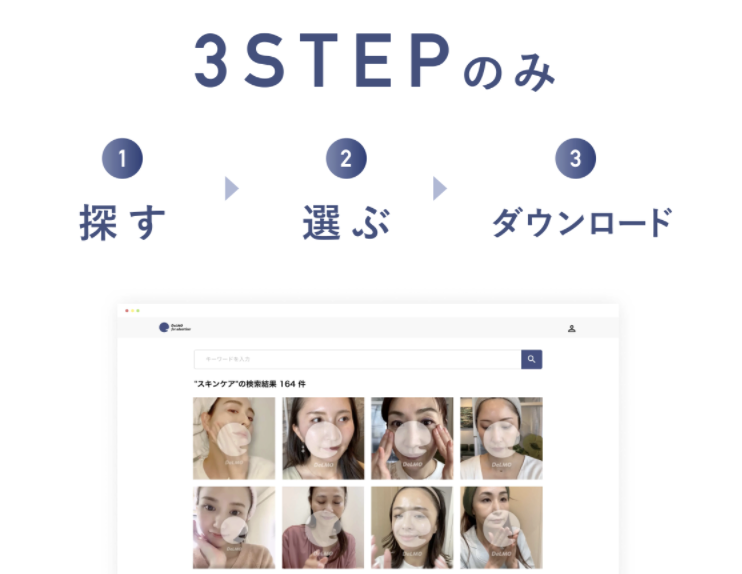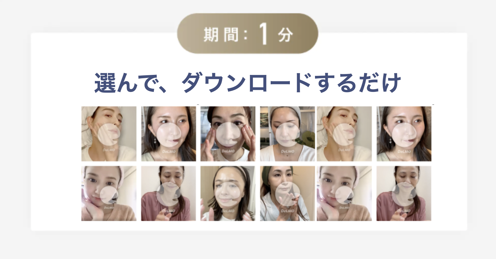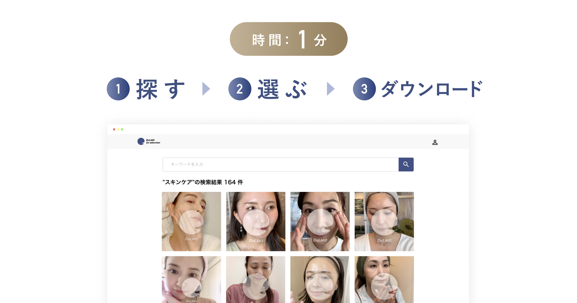 従来、動画広告のクリエイティブ制作に必要な動画素材を収集するためには、キャスティングや撮影内容の企画設計、ディレクション、撮影実施、リテイク、モデルからの質問対応など、素材収集の完了まで最低でも 2〜3週間程度かかっておりましたが、DeLMOを使用することにより、素材収集の完了までを最短1分程度に短縮することができます。