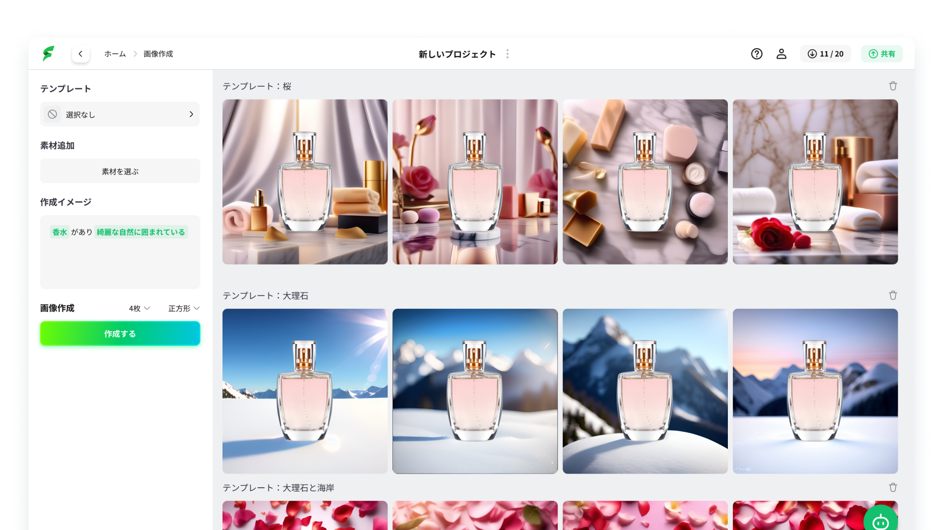 キャンペーンやシーズンごとで撮影が必要になるサイト内や広告の商品写真の作成を、生成AIの技術を用いて自動生成できる点が特徴です。商品の画像をアップロードし、作成したい商品のイメージを文字で入力もしくはテンプレートを選択するだけで、クリエイティブな商品写真を短時間で作成することが可能です。また、花や果物、土台や手など、素材を自由に配置し、思い通りの構図で商品写真を作成することも可能です。