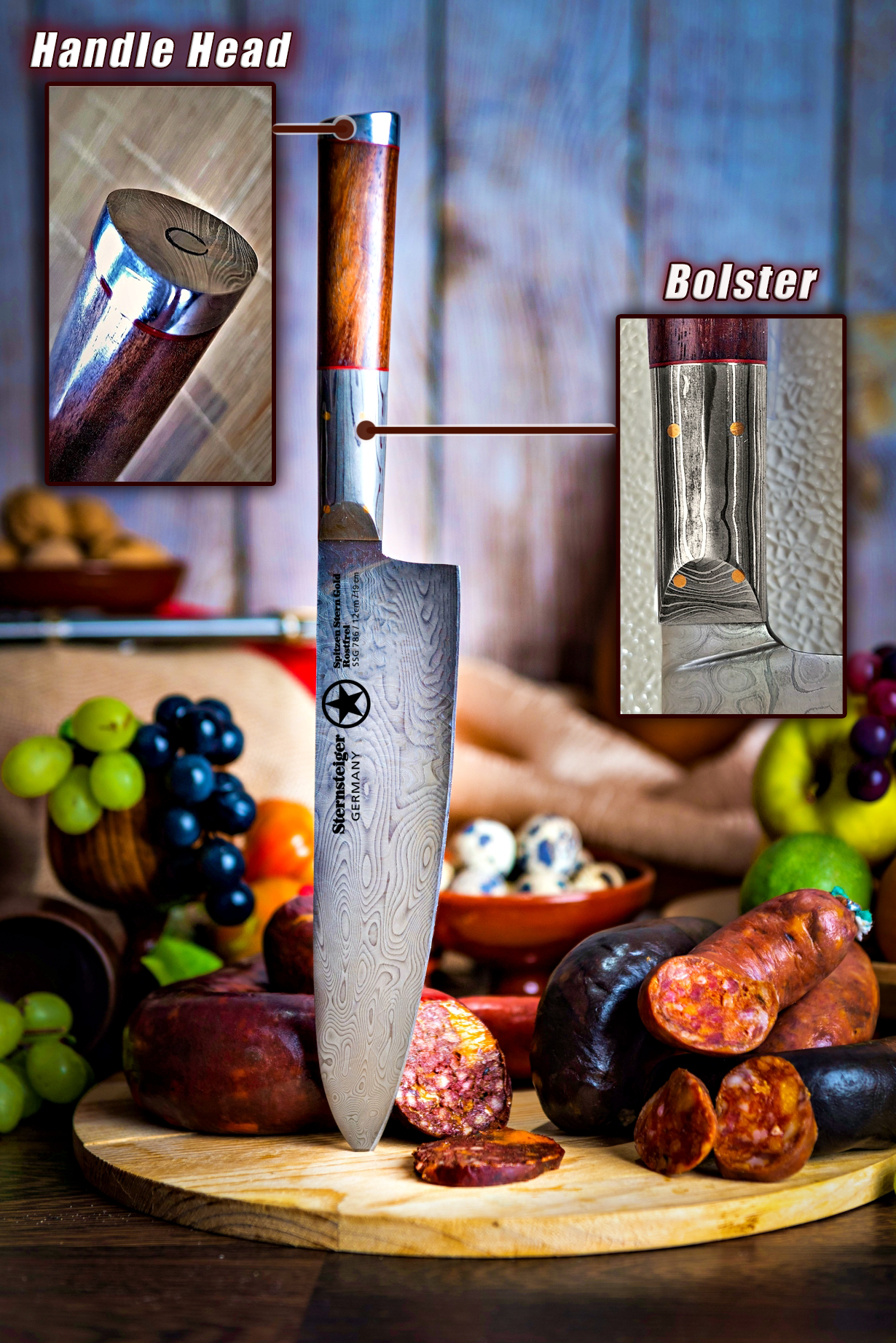 ハンドル上部から中央まで続くボルスター部分とハンドル柄尻にも、贅沢に美しいダマスカス・スティール鋼を使用しています。