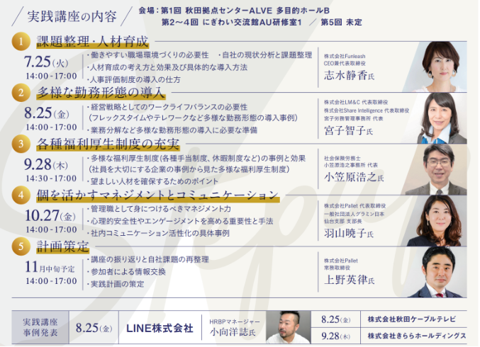 具体的には、秋田県の中小企業の人的課題・組織課題について、課題特定・目指す組織の姿、実現に向けての計画策定をし、解決に向けて具体的なヒントを発見いただく学びの場(実践講座)を用意しております。各実践講座での学びを、専門家が伴走しながら現場で実践し、変革を創り出していただきます。