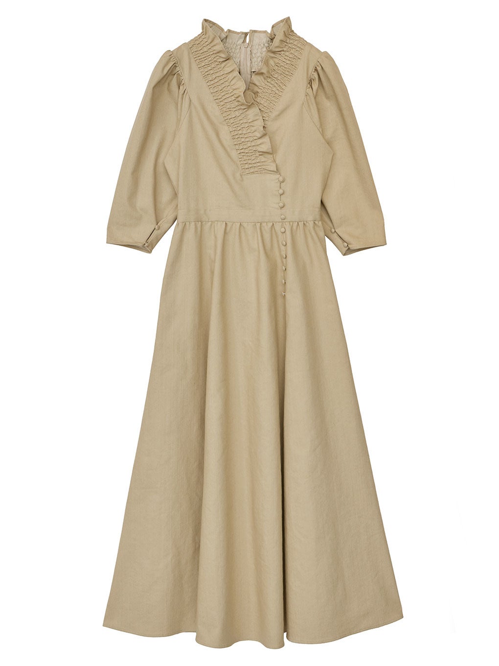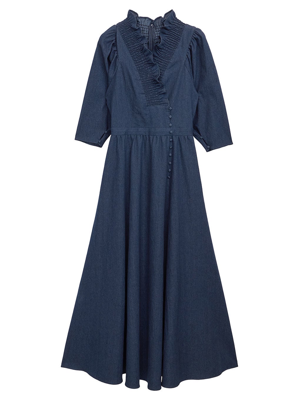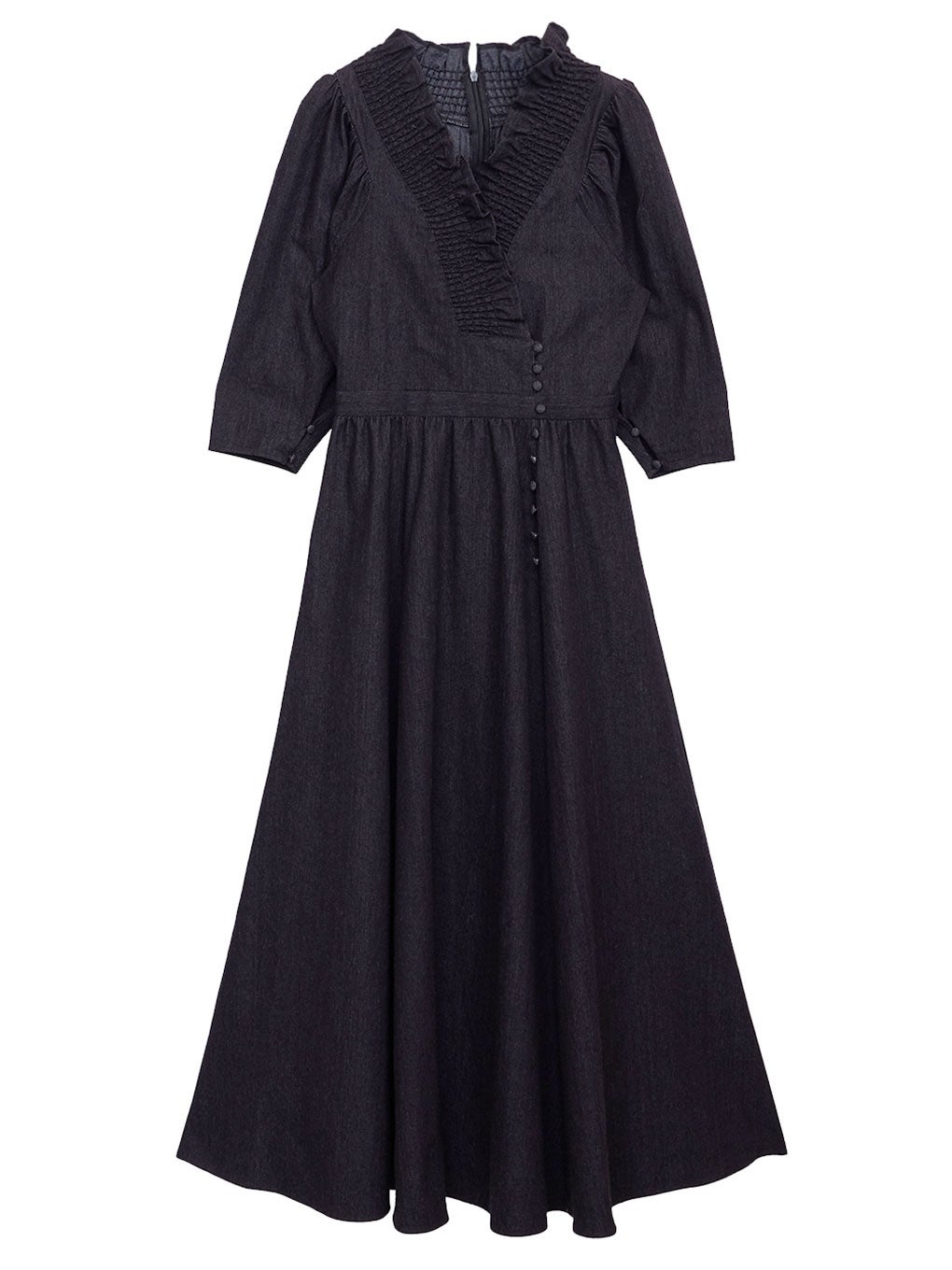 襟のシャーリングデザインがモードで女性らしいデニムドレス。
