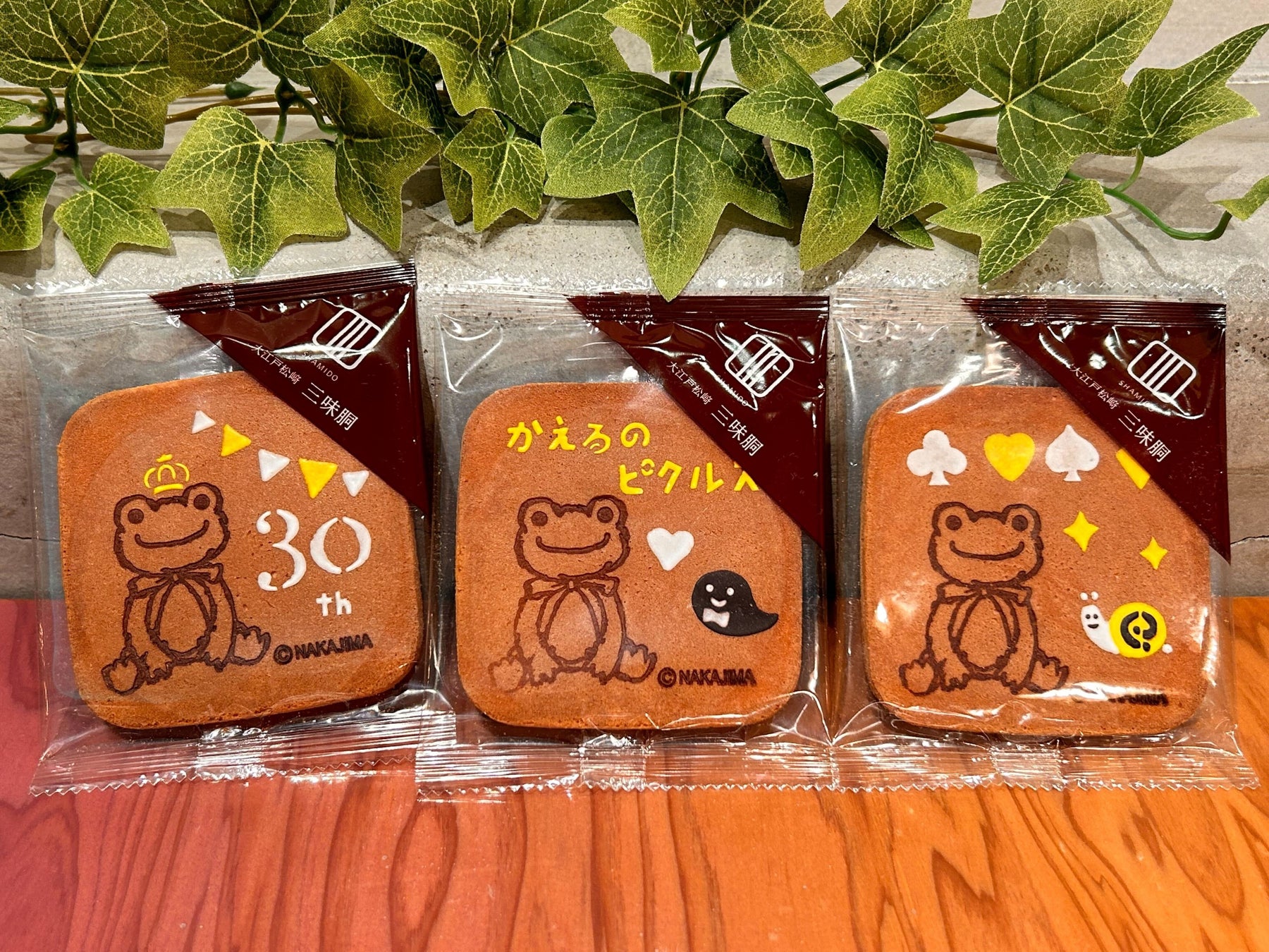 数量限定でかえるのピクルスデザインの三味胴セット(3枚入)もあわせて販売。お祝いの絵柄が華やかで可愛い、30周年を記念した限定絵柄となります。こちらもコラボ記念として、缶バッチが付きます。(全2種/バッジの種類はお選びいただけません)
