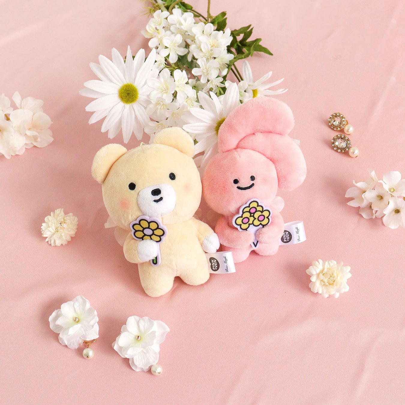 コラボノベルティのマスコットキーホルダーは、リサマリのアイコニックなお花を持ち、可愛らしさや春の心地よさ、大切な人へ自分自身への愛と感謝の気持ちを伝えています。