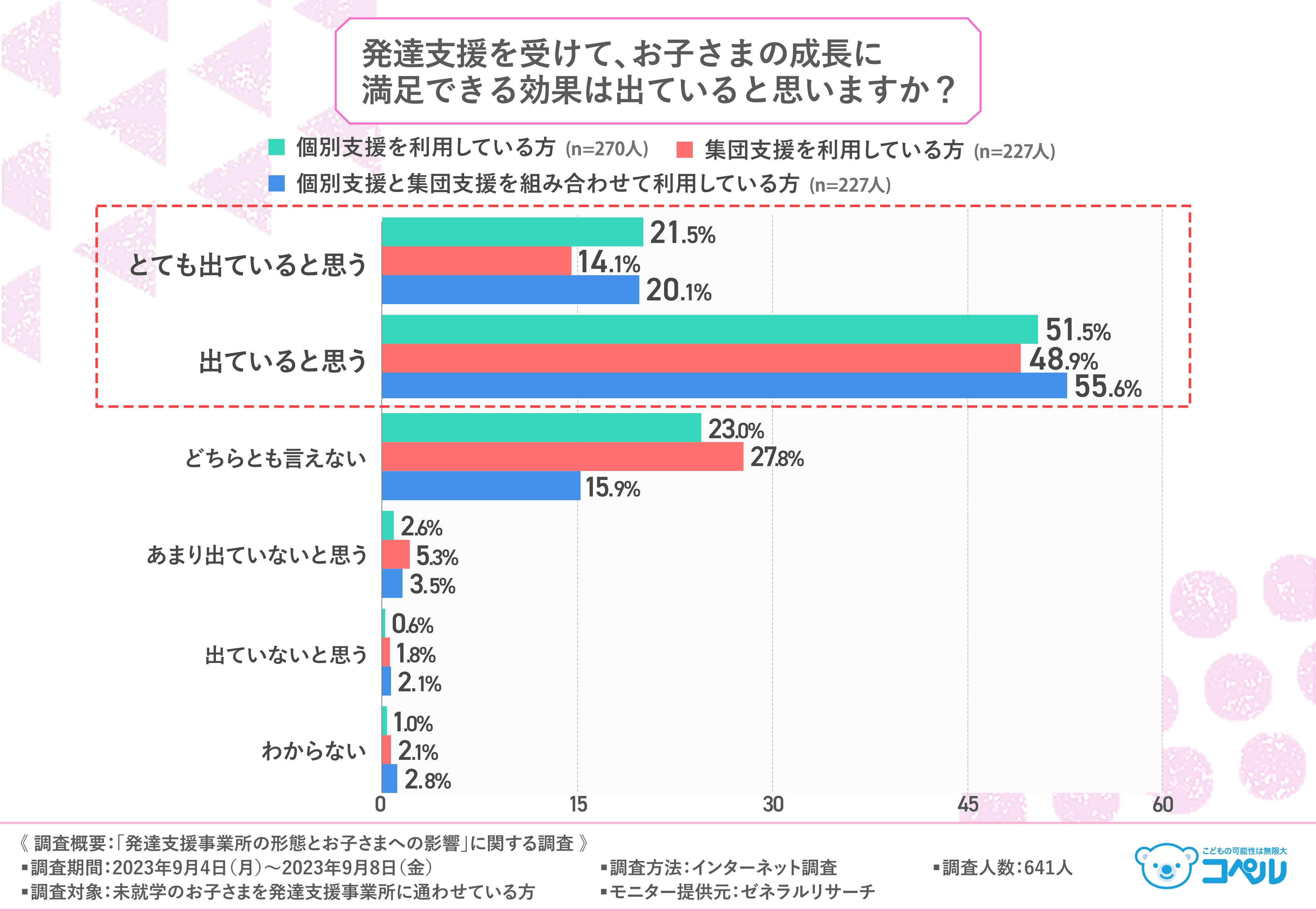 個別支援、集団支援それぞれに特徴があり、どちらの方が良いと言い切れないところもありますが、親から見た満足のいく効果が出ていると思う割合だと、個別支援と集団支援を組み合わせが最も満足のいく効果がでているようです。