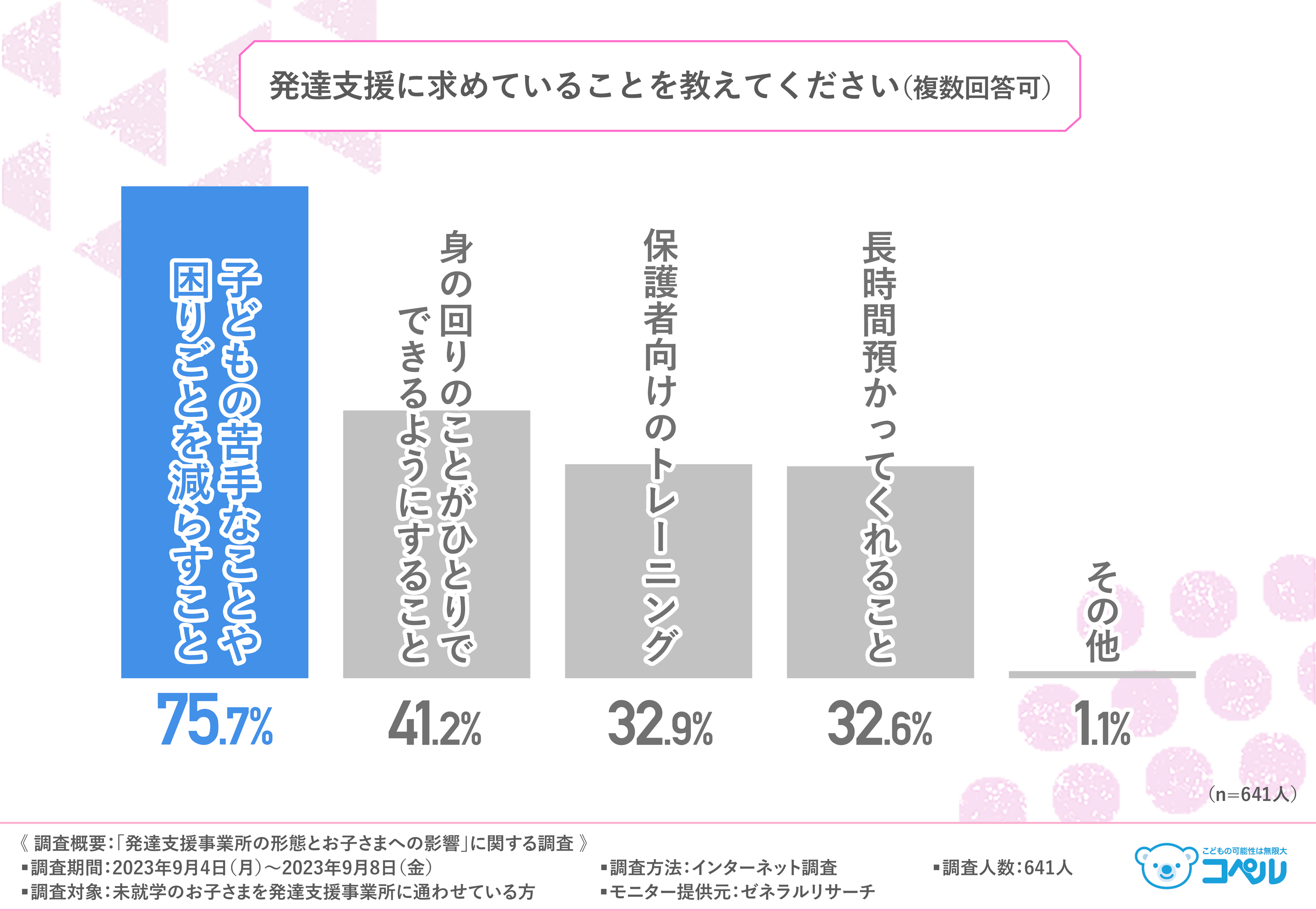 さらに「発達支援に求めていることを教えてください(複数回答可)」と質問したところ、『子どもの苦手なことや困りごとを減らすこと(75.7%)』と回答した方が最も多く、次いで『身の回りのことがひとりでできるようにすること(41.2%)』『保護者向けのトレーニング(32.9%)』『長時間預かってくれること(32.6%)』と続きました。