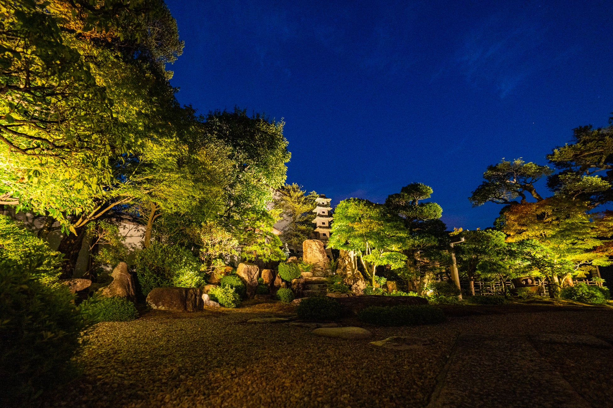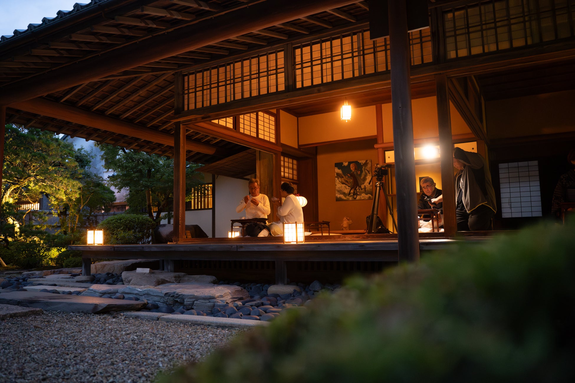 書院のふすまを全て開放し、目の前にあたたかい光で美しく彩られた江戸時代の枯山水庭園を見ながら“夜カフェ体験”をお楽しみいただけます。静けさの中に漂う柔らかな光が、心を癒すひとときを演出します。
