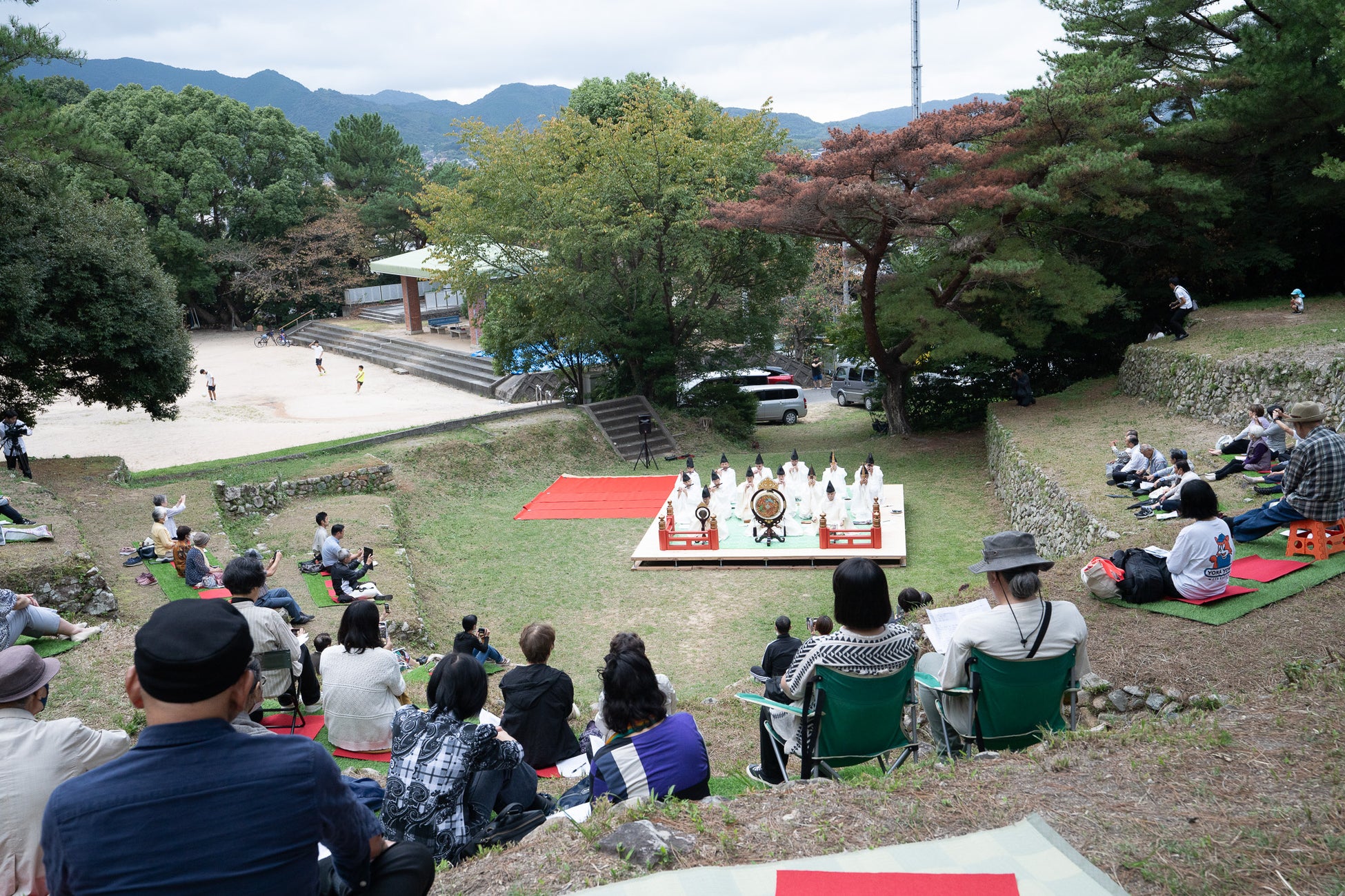 桟敷を利用して山口県神社雅楽会による雅楽コンサート「さじきで雅楽 ~ はじめての雅楽との出会い~」を開催しました。当日は多くの来場者が訪れ、幽玄な雅楽の調べに包まれた特別なひとときを堪能しました。さらに、演奏だけでなく、楽器の紹介コーナーも設けられ、奏者が実際に音を出しながら、それぞれの楽器の役割や特徴を分かりやすく解説しました。