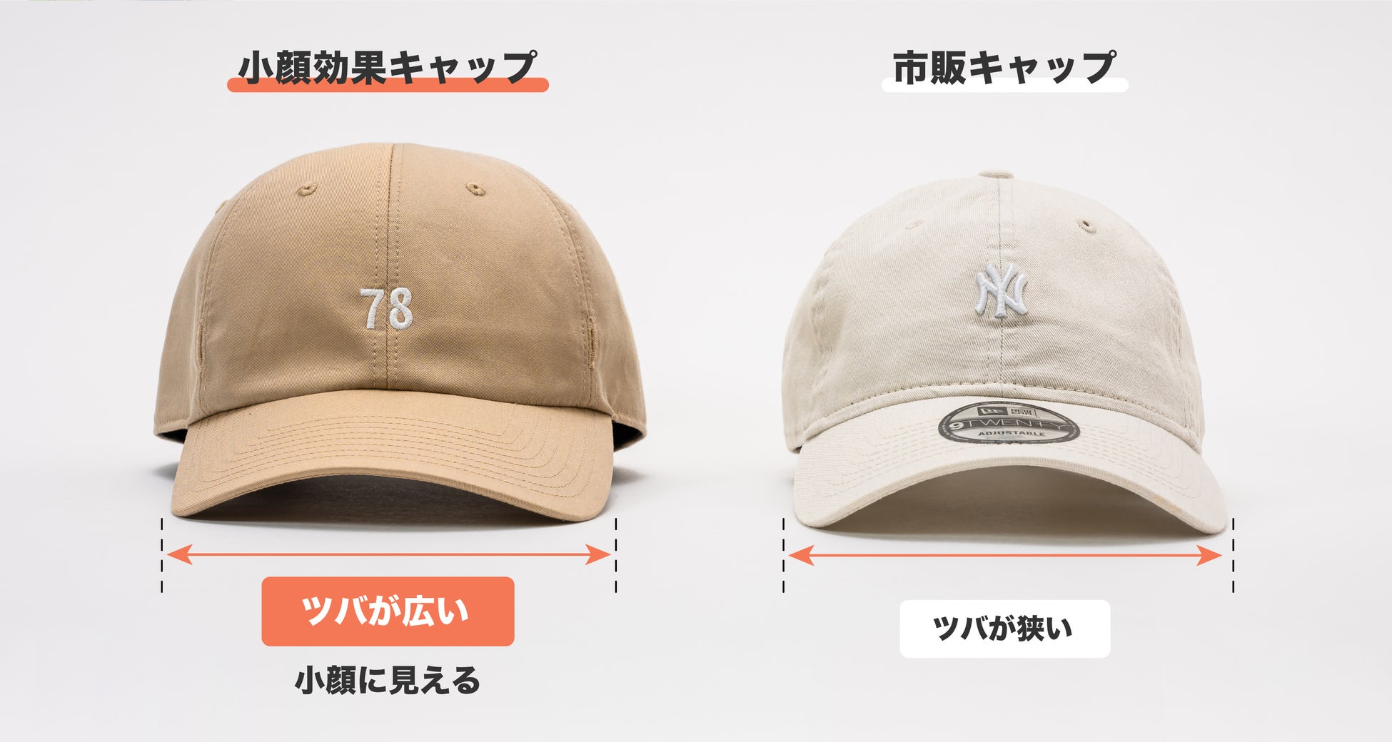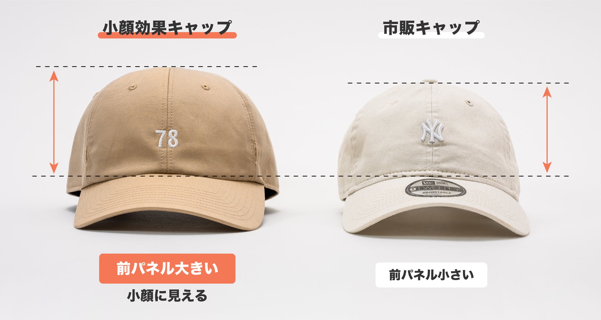ツバの大きさ・角度、パネルの大きさ等を分析し、「小顔効果」に特化して開発しています。市販キャップと比較して一目瞭然の「小顔効果」を得る事ができます。