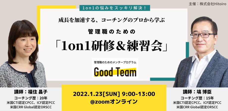 管理職のためのメンタープログラム「Good Team」を提供する、株式会社Hitoiro(東京都港区 代表取締役 山田 聖子)は、1on1での部下コミュニケーションに課題を感じる管理職向けに「管理職のための1on1研修&練習会」を2022年1月23日(日)9:00〜開催いたします。
