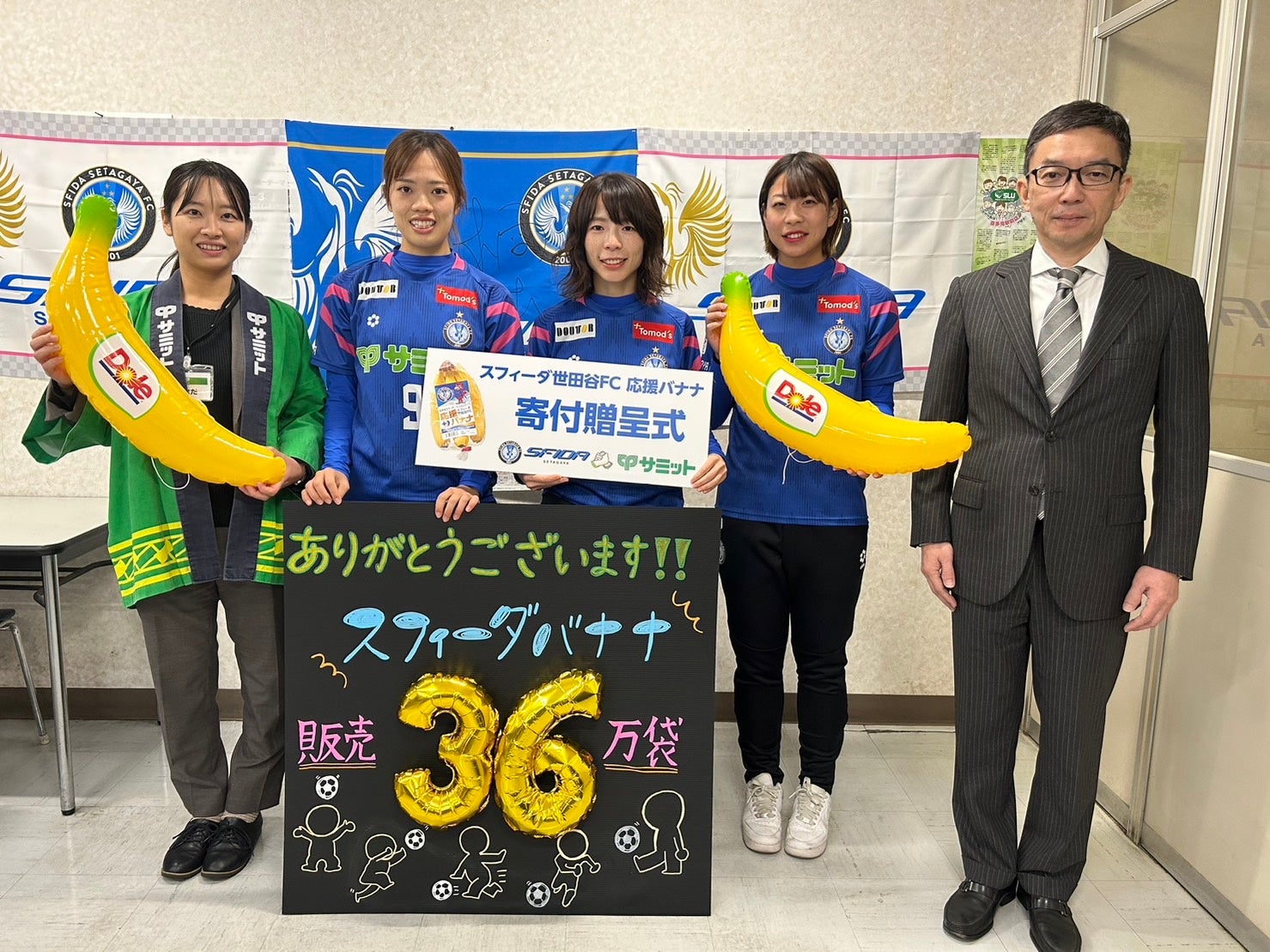 今回は、2022年7月25日から2023年9月の期間中、サミット株式会社様が運営するストア全店舗にて販売された「スフィーダ世田谷FC応援バナナ」の売り上げの一部より 1,099,359円をご寄付いただきました。