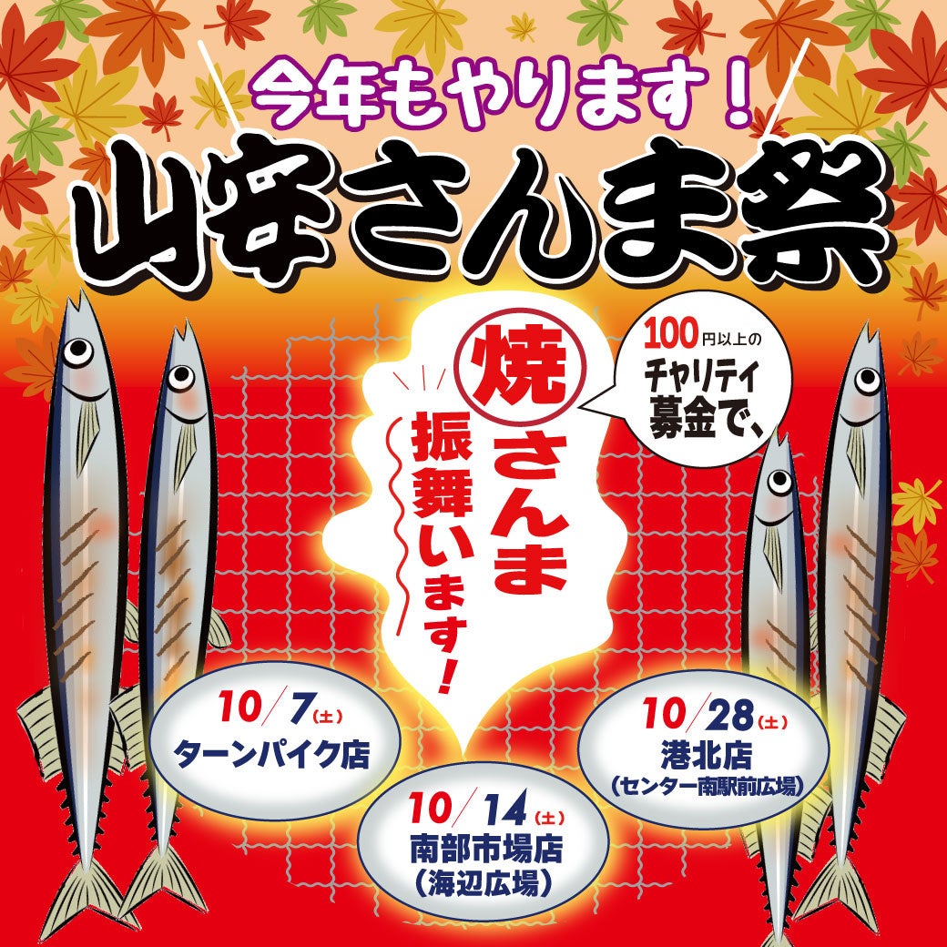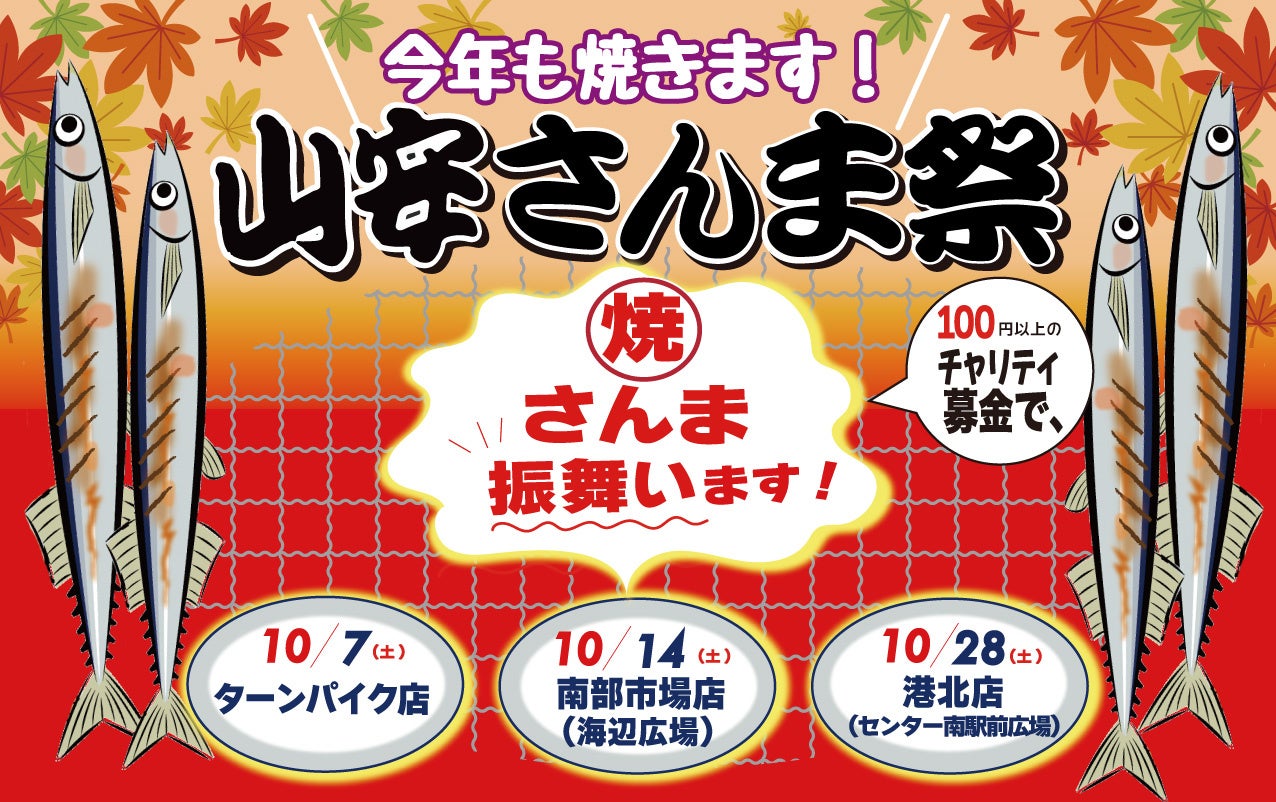 ここ数年サンマの不漁で大変な状況が続いておりますが、今年も10月7日(土)開催決定!「山安さんま祭り」第1弾 「山安ターンパイク店」にて、北海道より新鮮なサンマを2,000尾、10月14日(土)第2弾「横浜南部市場店」にて1,000尾、さらに10月28日(土)第3弾「港北店」にて2,000尾の 合計5,000尾、炭火で焼いたサンマを募金して頂いた方に振る舞う人気のチャリティーイベントです。